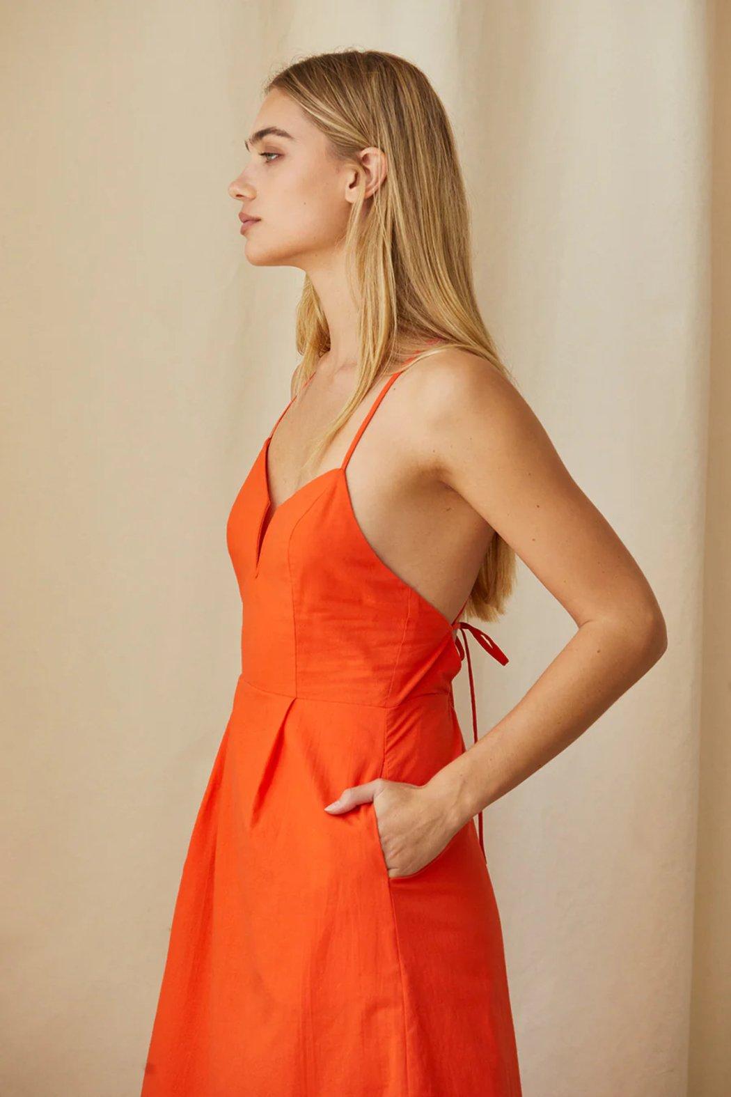 The Lucille V-Wire Cotton Dress features a flattering fit-and-flare silhouette with a structured V-wire neckline, adjustable back tie straps, and hidden side pockets. Made from breathable cotton and fully lined for comfort.