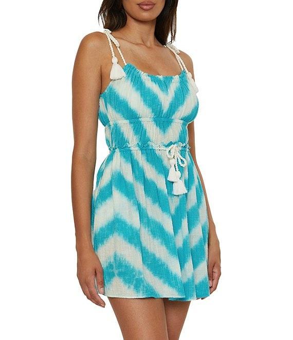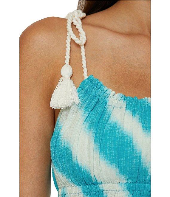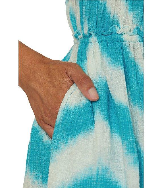 From Lucky Brand, this swim cover-up features: Gauze fabrication Dress silhouette Tie dye print Scoop neckline Adjustable rope tie shoulder straps Adjustable waist tie tassel Side pockets Unlined Flutter hemline Pullover construction Polyester/cotton/rayon Hand wash Imported.