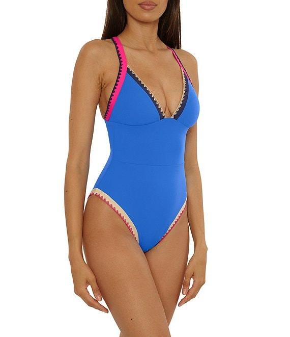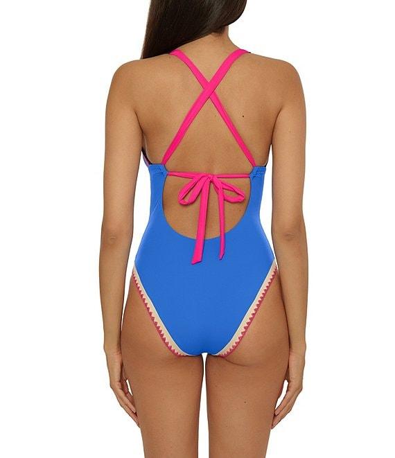 From Lucky Brand, this one piece swimsuit features: Tank silhouette Colorblock banding Removable soft cups Adjustable straps Contrast shell stitching Adjustable tie back Moderate coverage Lined Pull-on construction Nylon/spandex Hand wash Imported.