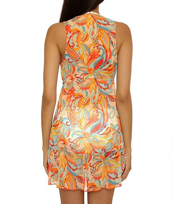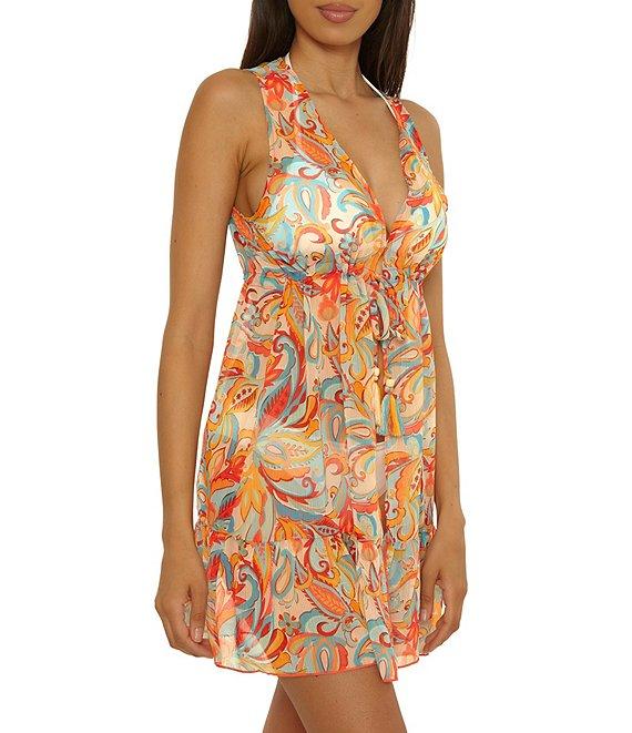 From Lucky Brand, this swim cover-up features: Chiffon fabrication Tunic silhouette Paisley print Open front neckline Sleeveless Adjustable drawstring tie Multi color tassel sand wood beads Soft flutter hem Open front; no closure Approx. 34.5" length Polyester Hand wash Imported.
