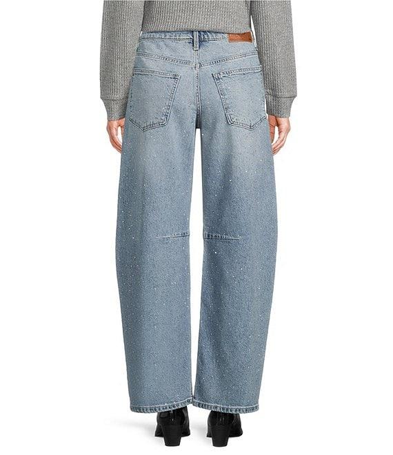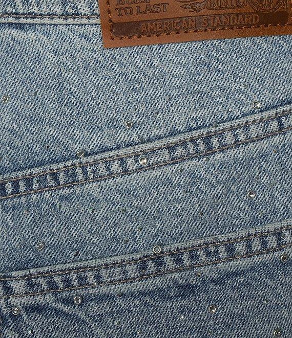 From Lucky Brand, these jeans feature: Stretch denim fabrication Belt loops 5 pocket style Wide barrel leg silhouette Rhinestones covering pants Ankle length Front button and zipper closure Approx. 30" inseam Cotton/elastane Machine wash Imported.