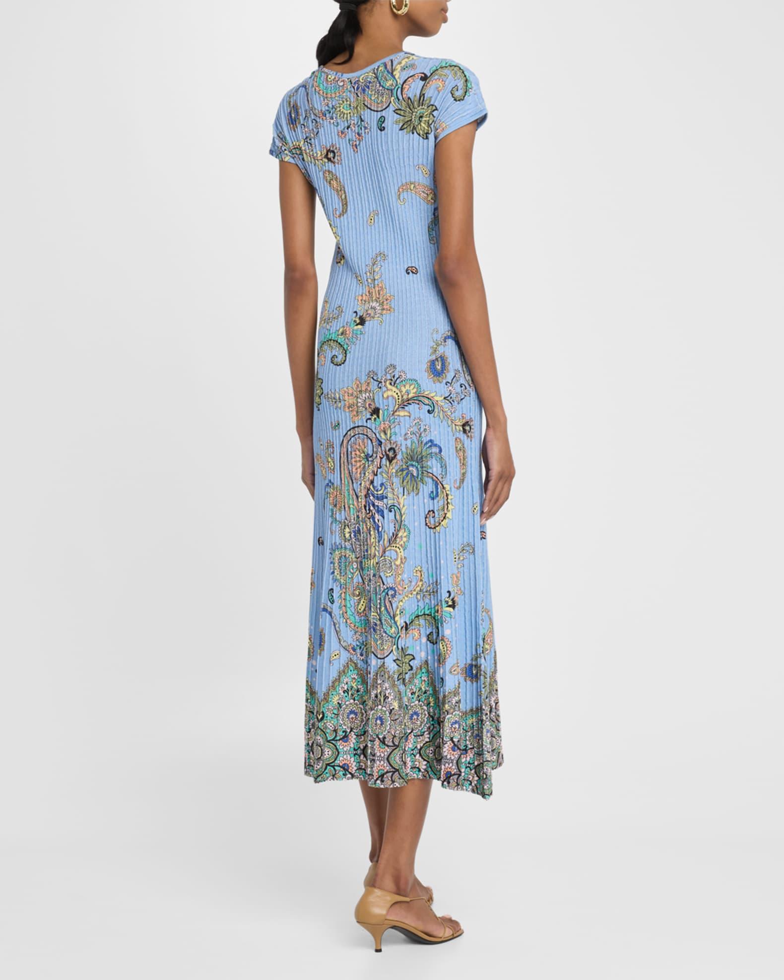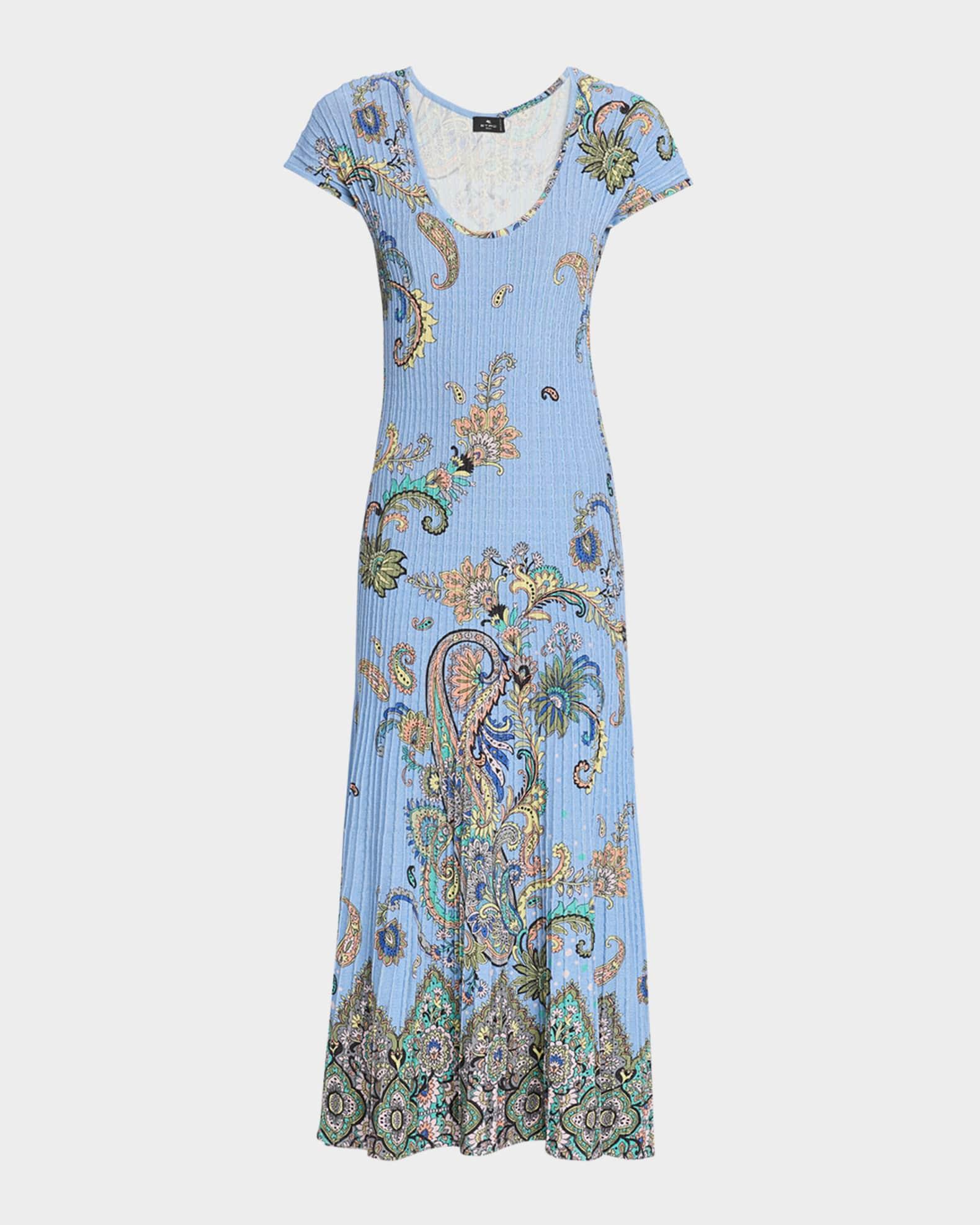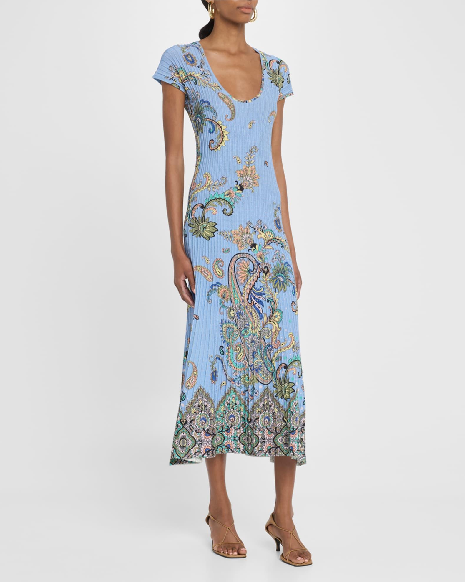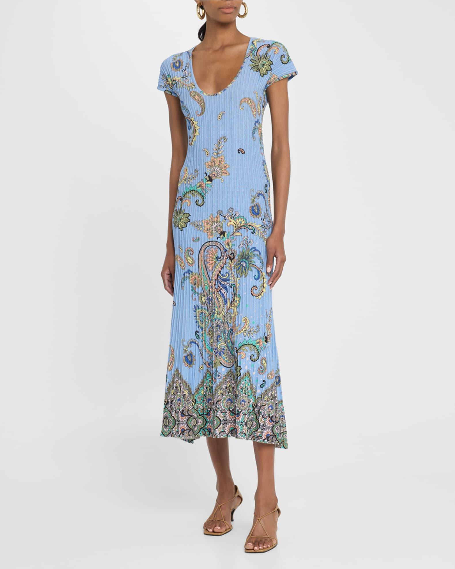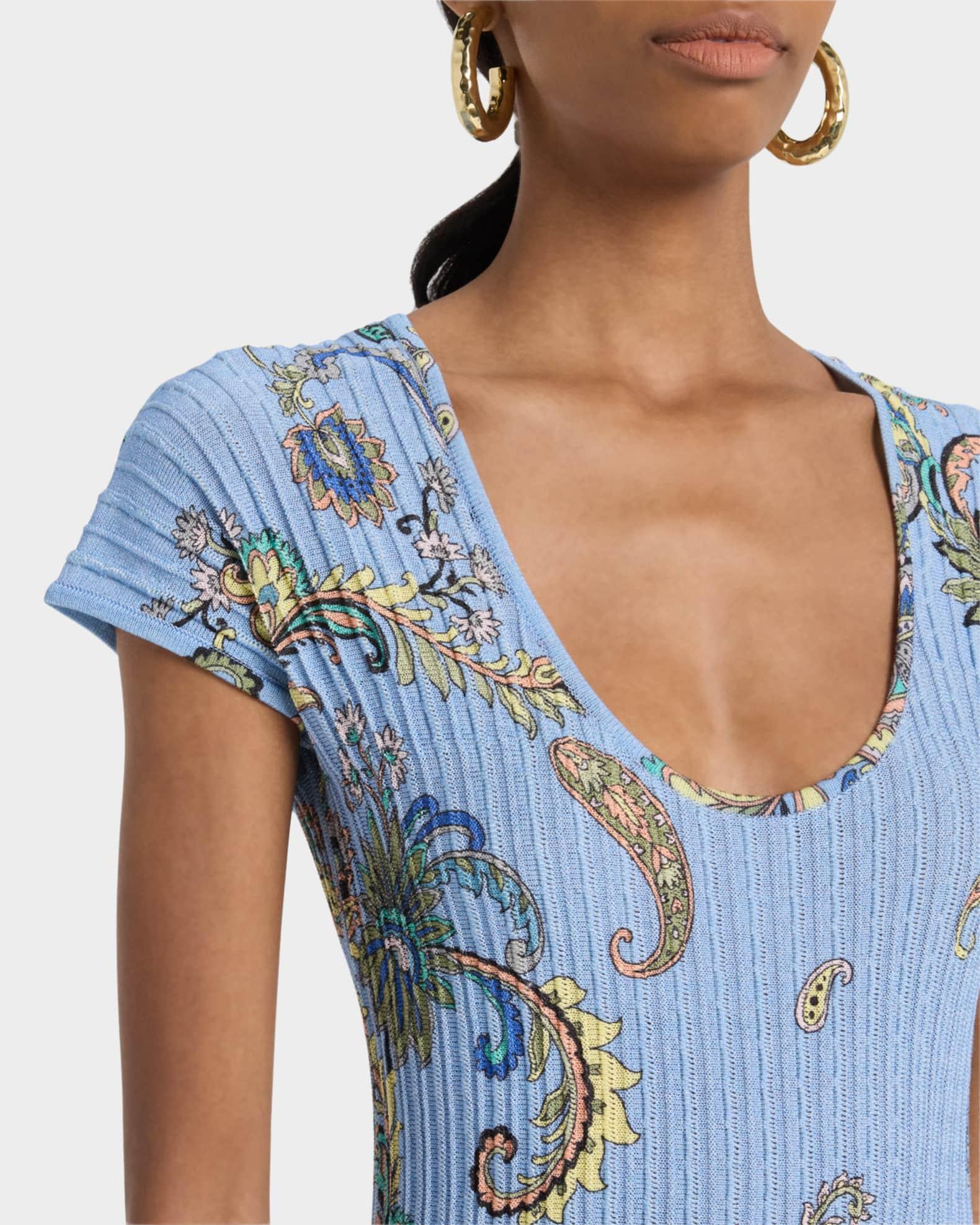 Etro ribbed knit dress with a blue Lucky Charm print Scoop neckline Cap sleeves A-line silhouette Hem falls below the knee Slipover style Viscose/cotton Made in Italy