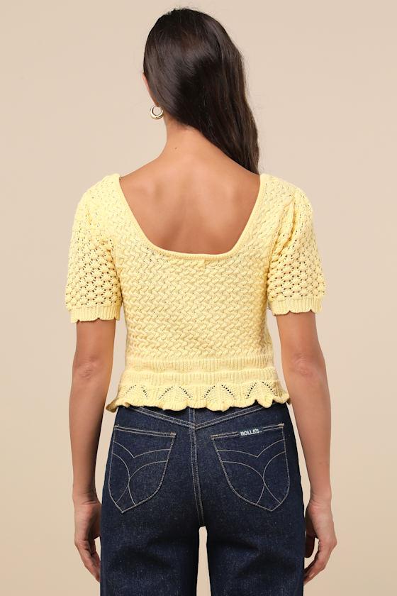 It's bound to be a good day for compliments whenever you style the Lulus Lucky Cutie Bright Yellow Crochet Short Sleeve Sweater Top! Lightweight loosely-knit crochet shapes this effortlessly cute sweater top with a flattering square neckline framed by short sleeves. The fitted bodice features intricate detailing before ending at a slightly cropped hem. Scalloped edges accent the cuffs and hem for a vintage-inspired finish.