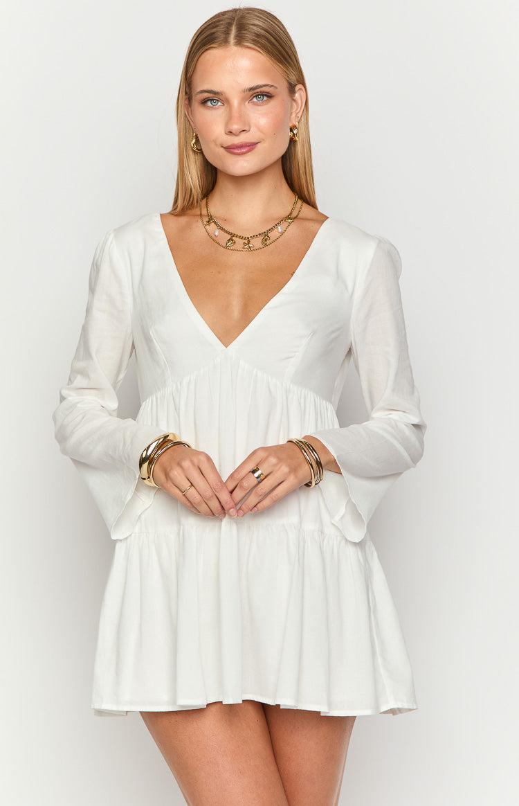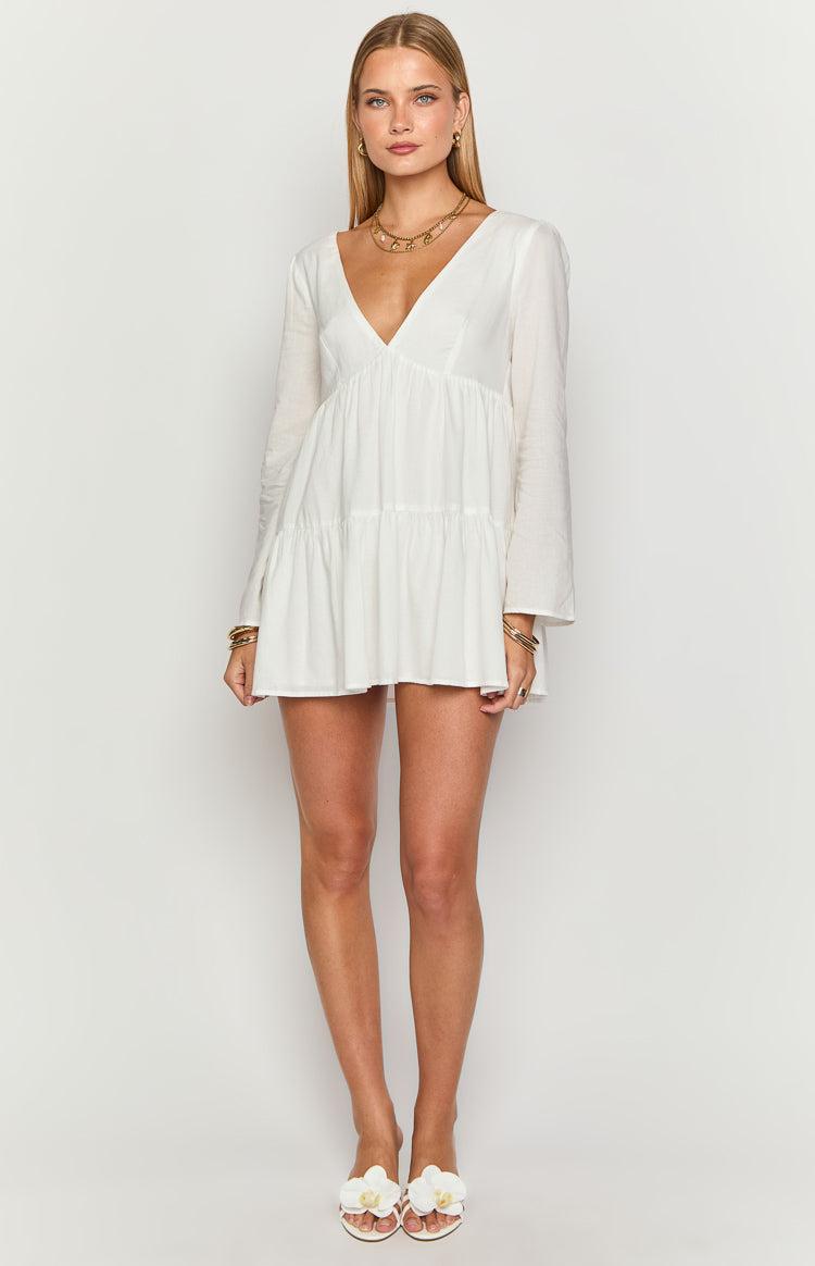White Long Sleeve Tiered Mini DressHow to style:Effortlessly chic and totally romantic, our Lucky Heart White Long Sleeve Mini Dress is a perfect blend of breezy charm and feminine allure. The deep V-neck and tiered skirt create a beautifully flattering silhouette that works for both casual and dressed up occasions. Pair it with ankle boots for a stylish daytime look, or elevate it with heels and statement earrings for a memorable dinner date!Features: Mini length Fully lined Lightweight cotton material V-neckline Long fluted sleeves – unlined Tiered skirt Pull-on style Perfect for parties, date nights, and summer events!