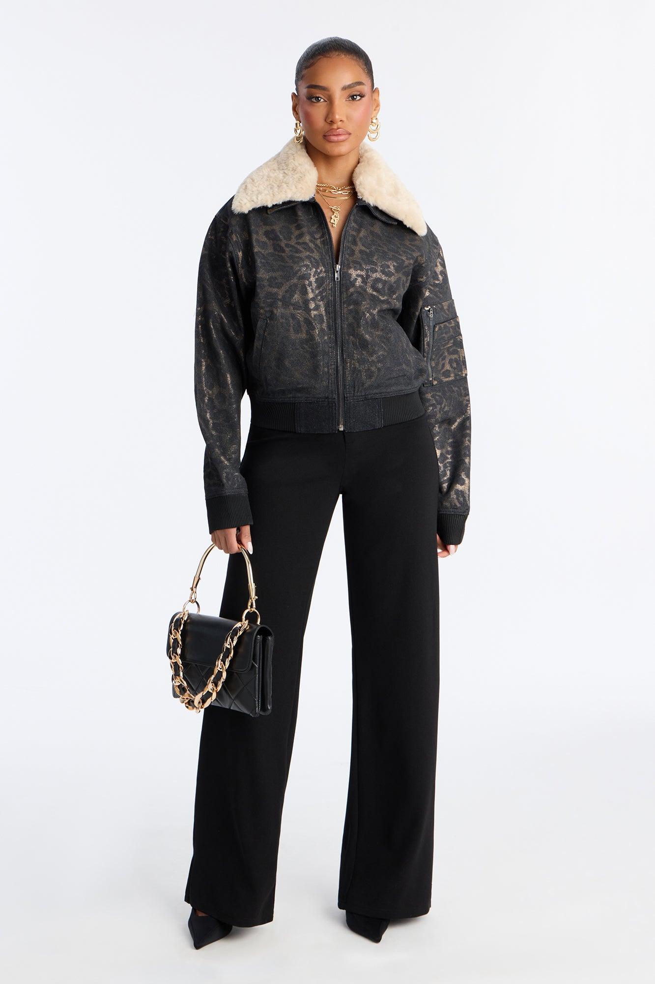 Available In Black/combo. Denim Bomber Jacket Foil Animal Print Zipper Closure Faux Fur Collar Front Pockets Non Stretch Disclaimer: Print Placement Will Vary. Self: 58% Cotton 24% Rayon 18% Polyester Faux Fur: 100% Polyester Imported California Proposition 65WARNING: Cancer and Reproductive Harm - www.P65Warnings.ca.gov.