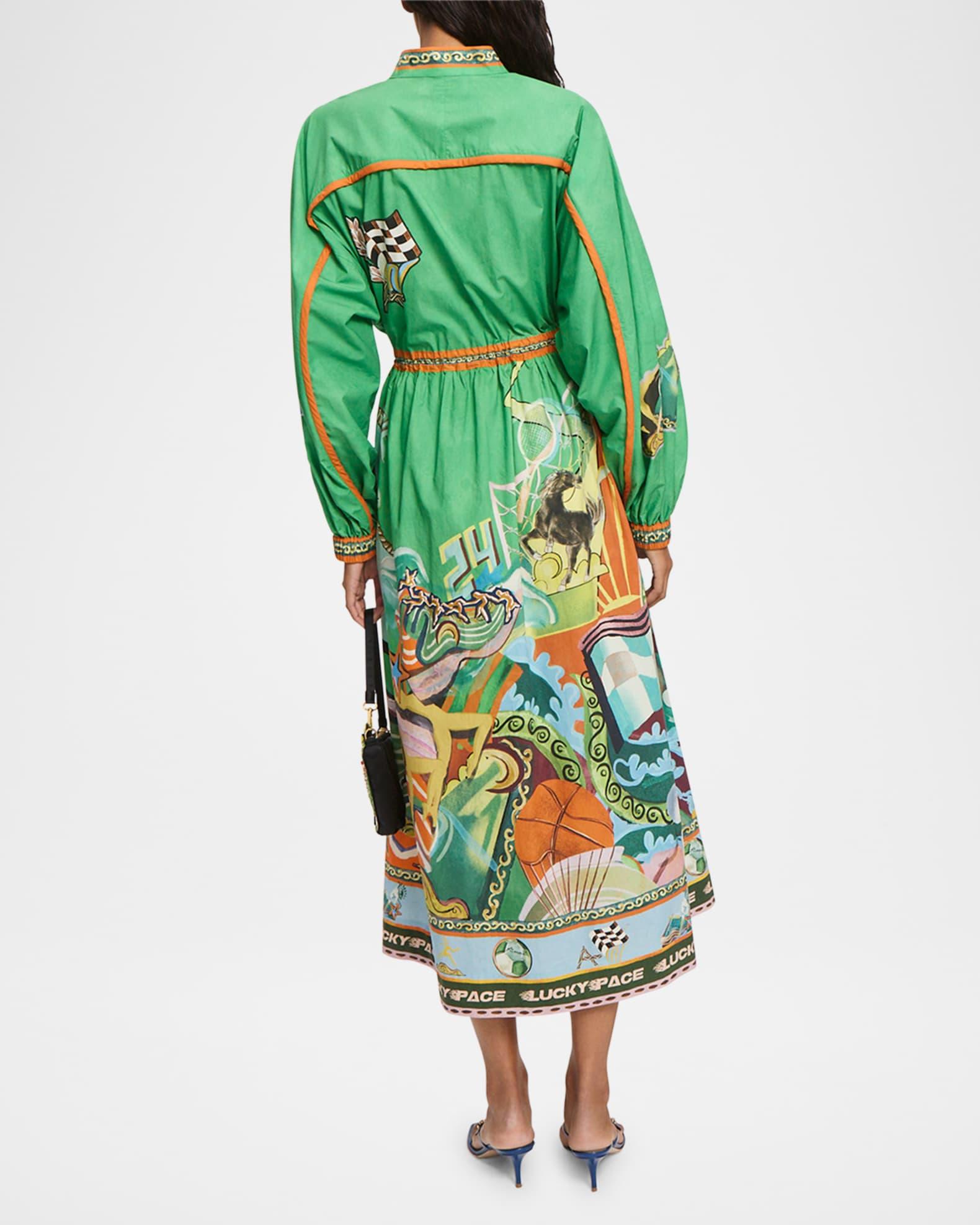 ALEMAIS shirtdress illustrated with a bold mixed-graphic print with contrasting trim detail Band collar; concealed placket with self-covered buttons Long blouson sleeves; elastic cuffs Side seam pockets Self-covered rouleau drawstring belt Hem falls below the knee Full a-line skirt Organic cotton Imported