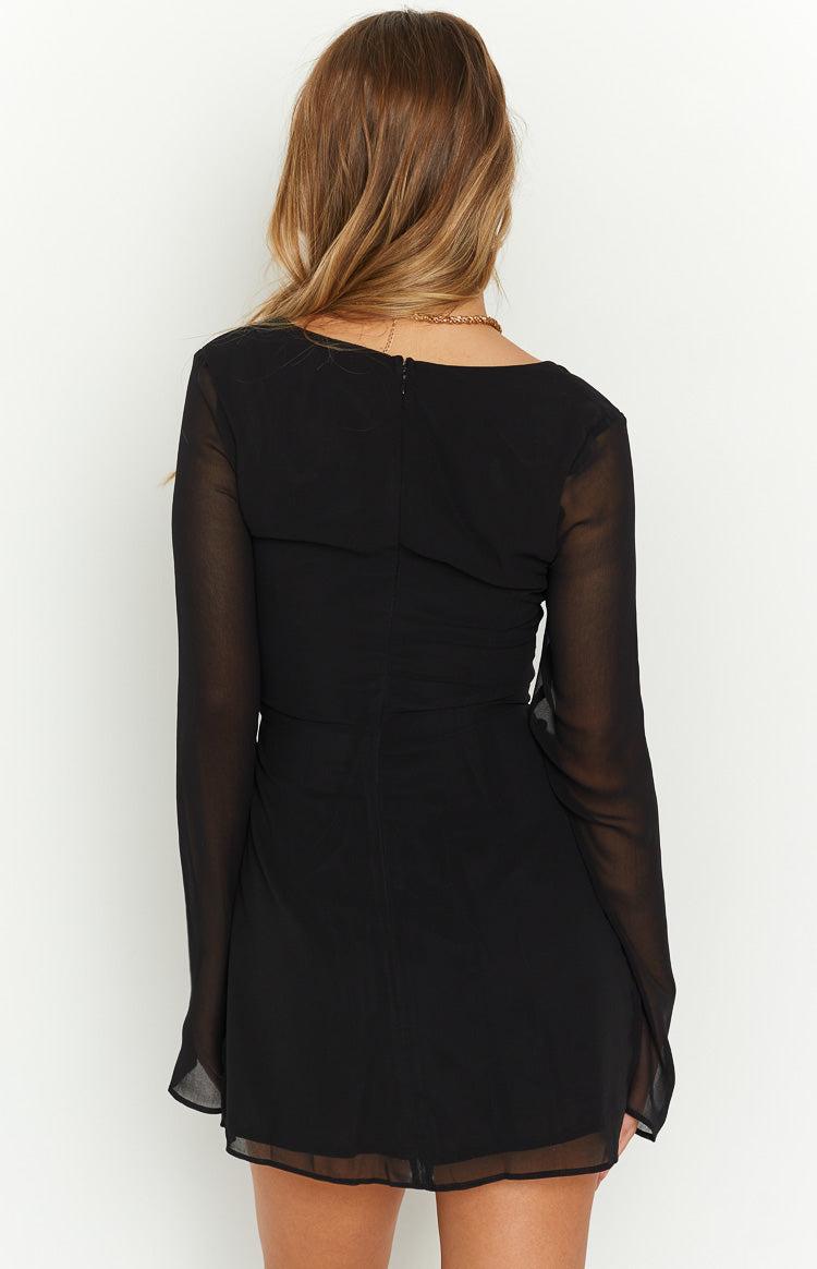 Black Long Sleeve Mini Dress How to style: This cute Black Long Sleeve Mini Dress is perfect for cocktails and a night out with the girls. Easily pair it with a pair of strappy heels and gold jewellery to be the 'it girl' of your next event. Features: Light weight material Long Sleeves Square neckline Wrap skirt with an adjustable tie on the left of the bodice Mini Length Sheer material Body lined, arms unlined Invisible zip on the back This dress is perfect for homecoming!