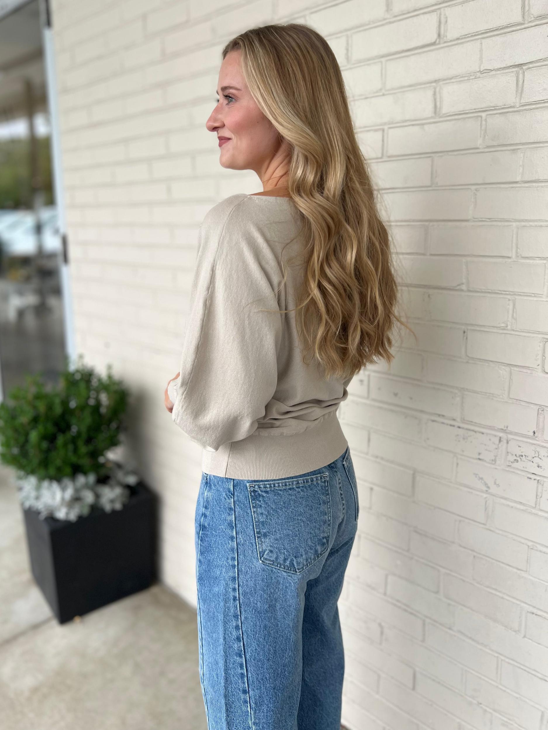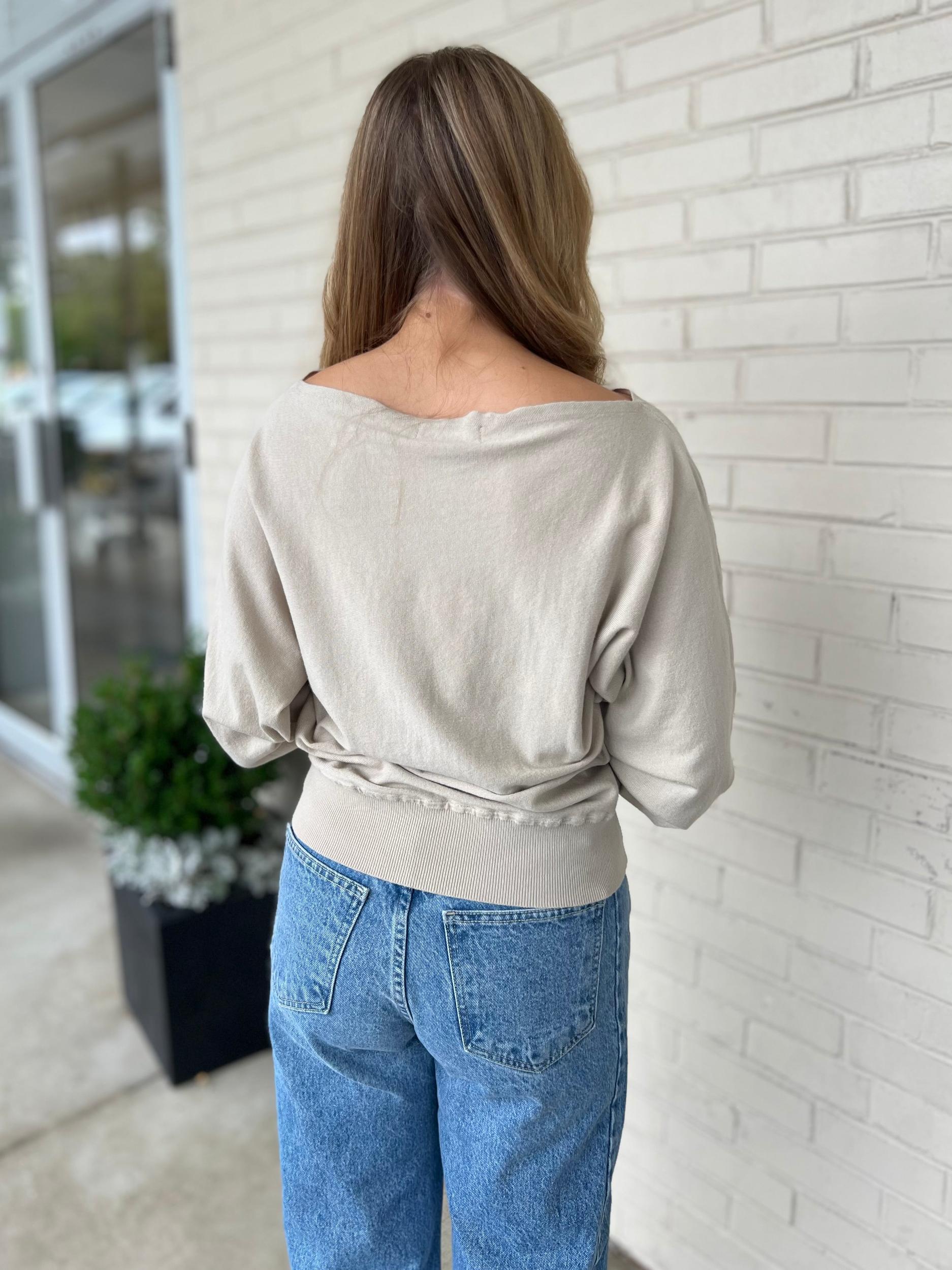 The Lucy Top brings a fun twist to your wardrobe with its cozy beige fabric and playful batwing sleeves. Featuring a chic boatneck and a snug ribbed hem, it’s perfect for adding a breezy, stylish vibe to any outfit. Whether you’re out with friends or lounging at home, this top keeps comfort and flair in perfect harmony.