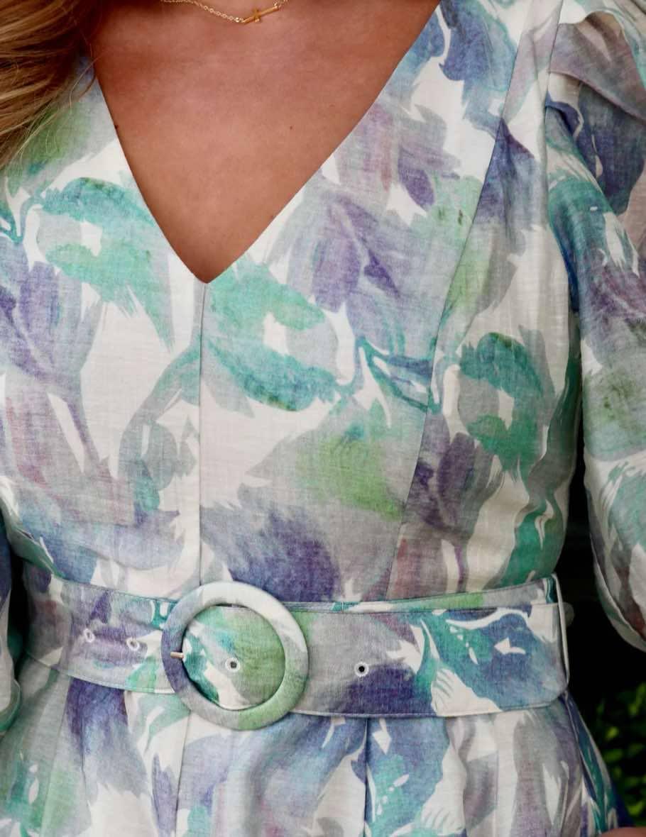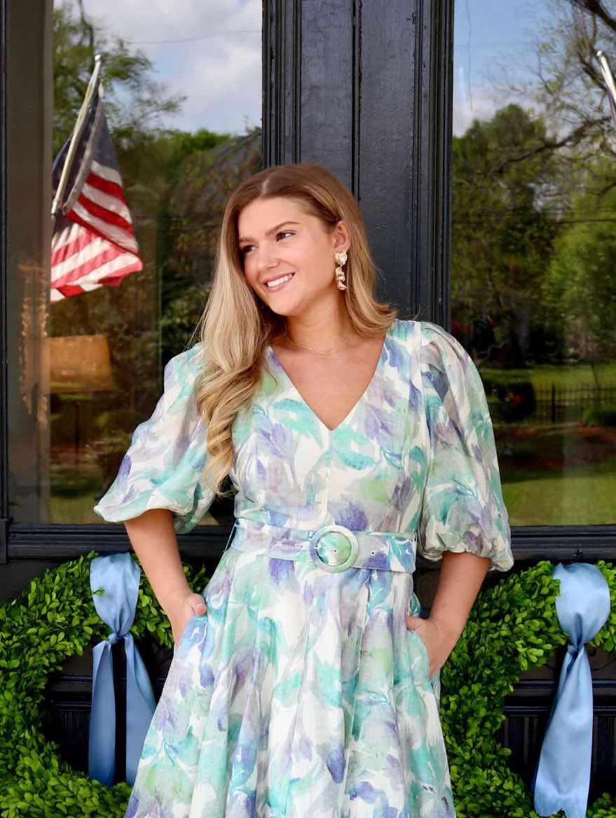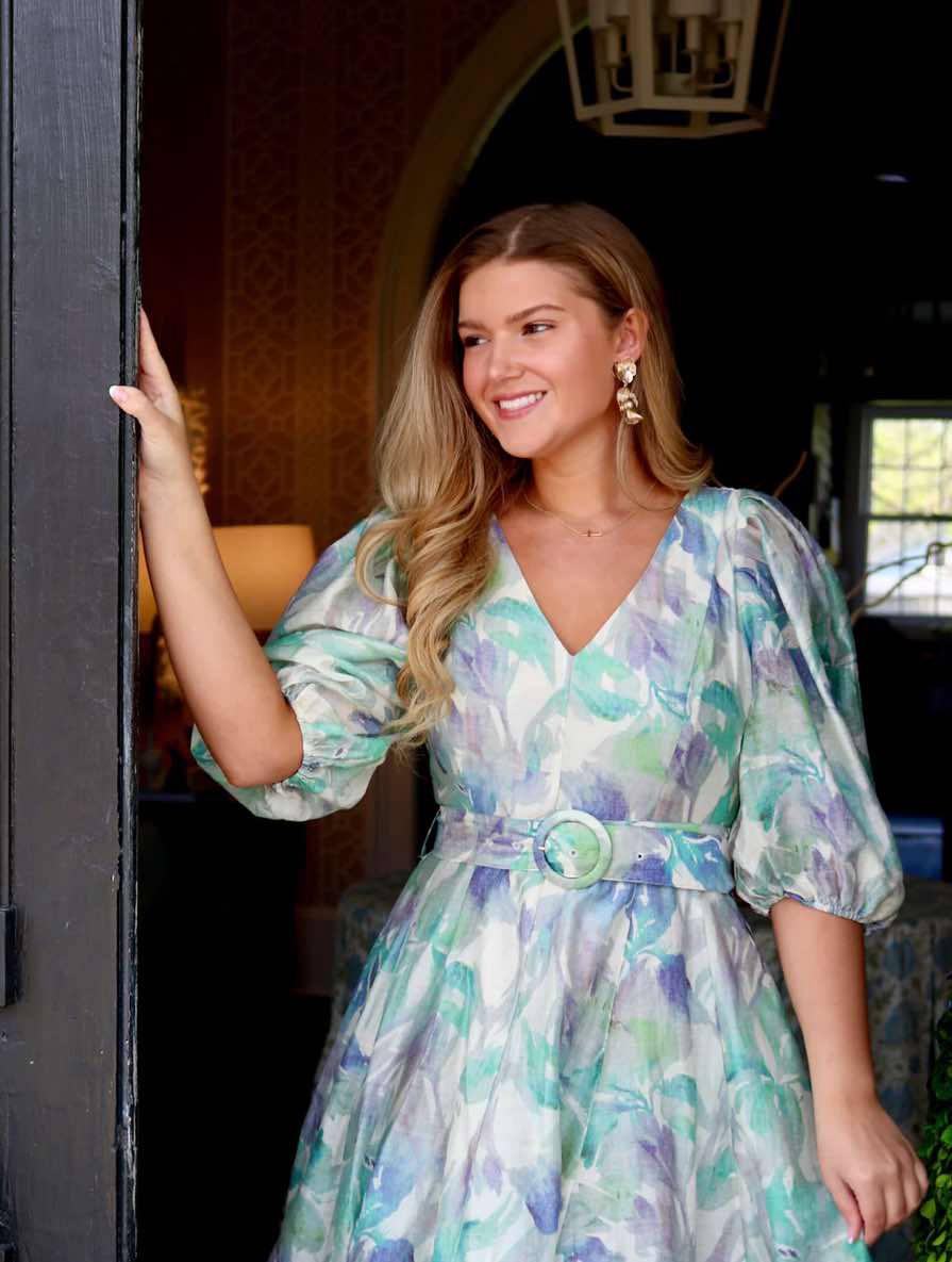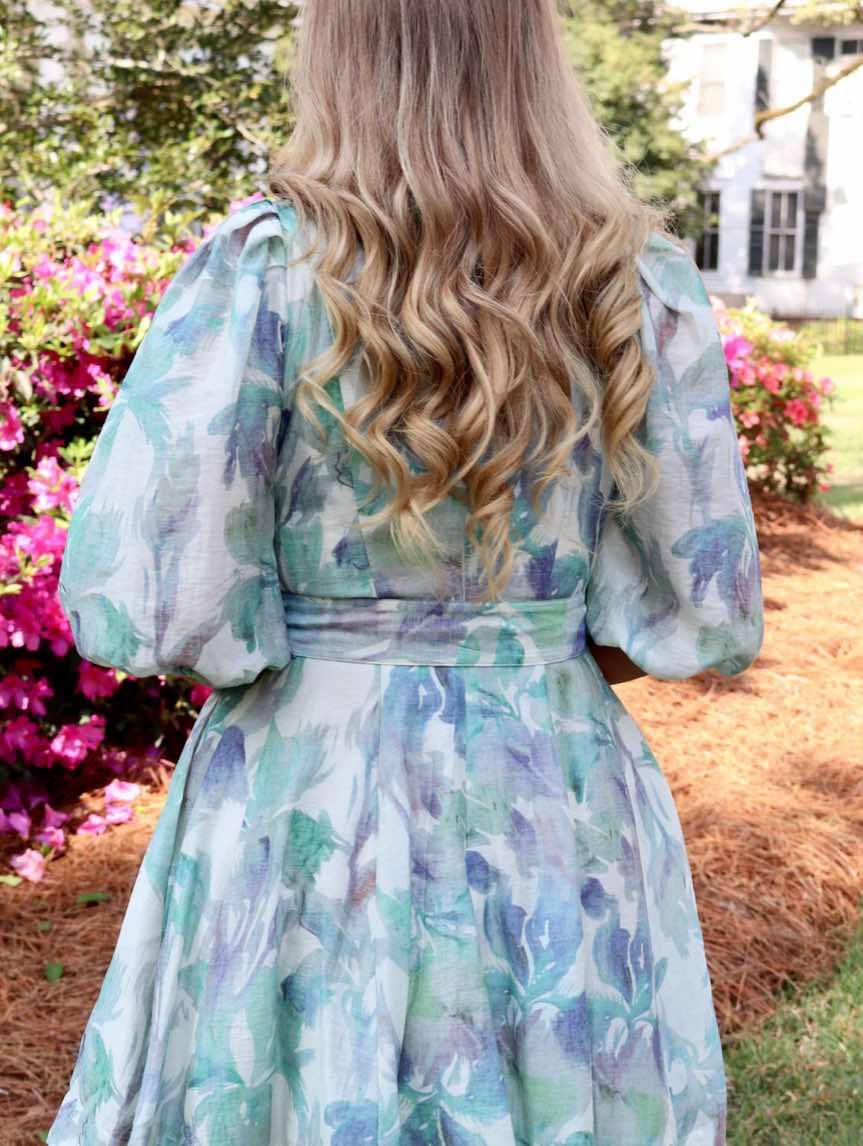 This dreamy watercolor floral dress features a flattering V-neckline, voluminous puff sleeves, and a flowy, twirl-worthy skirt. The pastel blend of greens, purples, and soft blues creates a romantic, ethereal look, while the matching fabric belt with a round buckle cinches the waist for a beautifully defined silhouette. Perfect for spring events, brunch dates, or garden parties, this dress brings elegance and whimsy together in effortless style.