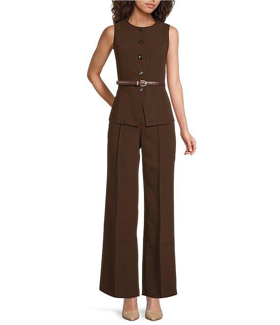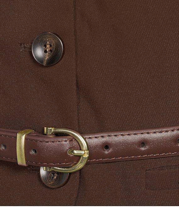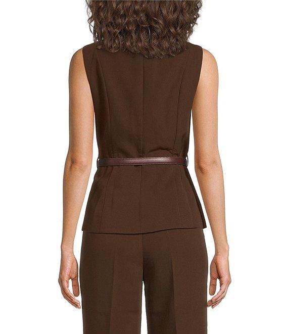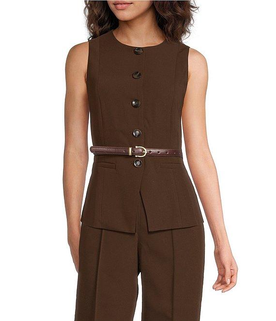 From Lucy Paris, this vest features: Woven fabrication Scoop neckline Sleeveless Button front closure Front welt pocket Belted Fitted fit Fully lined Straight hemline Approx. 25.5" length Polyester; lining: polyester/spandex Machine wash Imported.