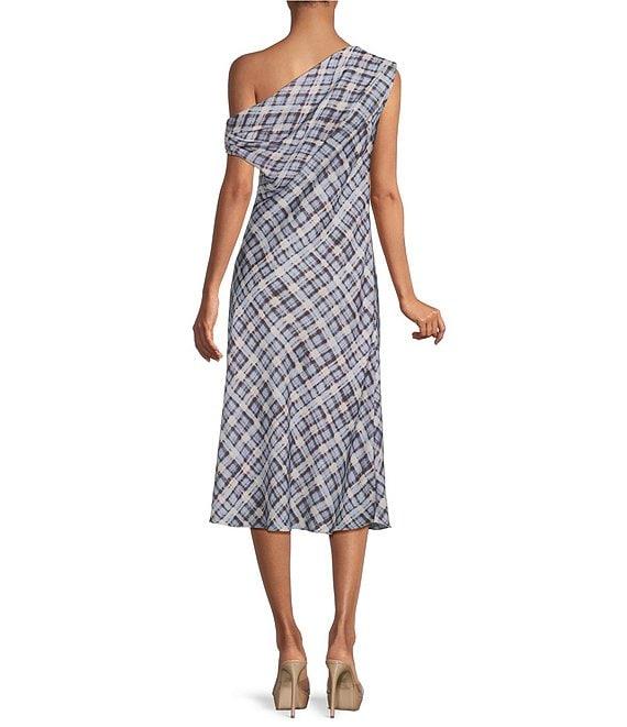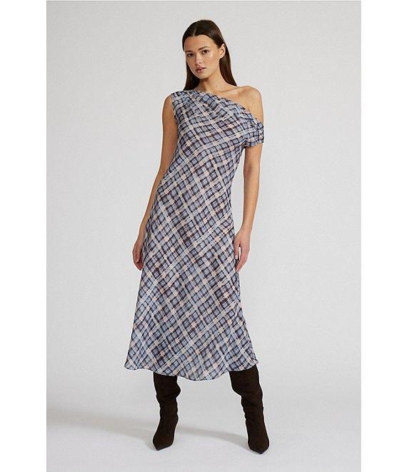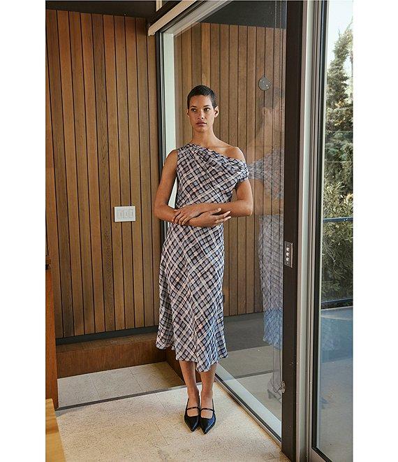 Lucy Paris Plaid Print Asymmetrical Neck Sleeveless Midi Dress