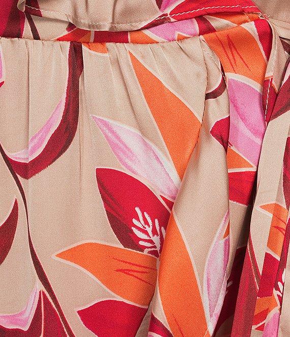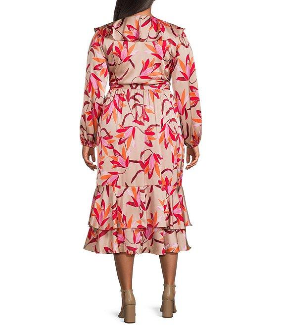 From Lucy Paris Plus, this dress features: All-over floral print Ruffled surplice v-neckline Long sleeves Faux-wrap front with side tie detail Asymmetrical ruffled skirt with asymmetrical hem Pullover styling 49" high point shoulder length Shell of polyester; lining of polyester/spandex Machine wash/tumble dry Imported.