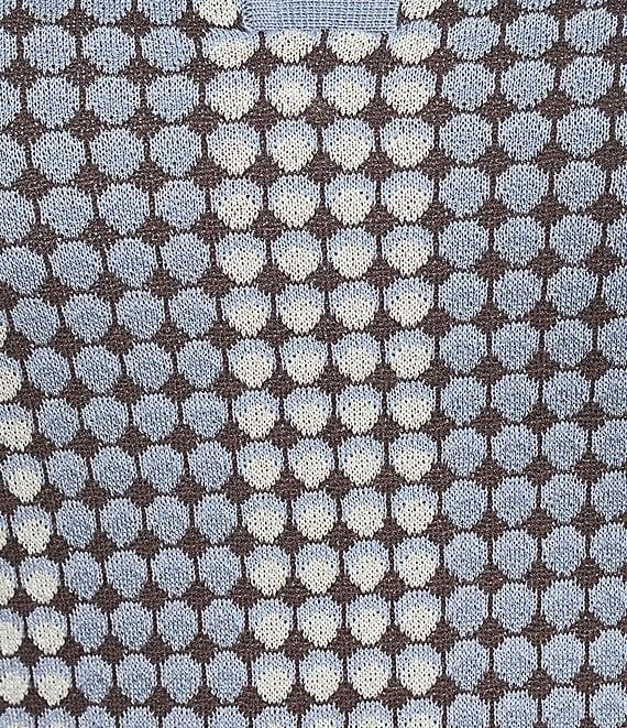 From Lucy Paris, this sweater features: Allover print Point collar Short sleeves 3-Button front closure Cuff sleeves /hem Approx. 23.5" in length from the high point shoulder Pullover styling Polyester/rayon Hand wash/line dry Imported.