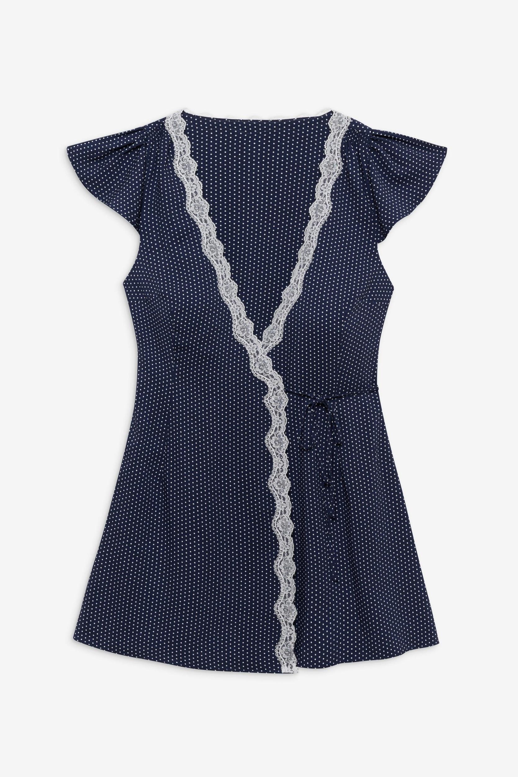 The Lucy mini dress is the epitome of a true functional wrap dress, featuring a light and flowy skirt and a fitted bust. Perfect for summer parties, you'll love how this mini dress transitions from day to night effortlessly. Details Blue and white polka dot print Lightweight crepe fabric Adjustable tie at the waist Flounce sleeves with a center slit Lace trim along the neckline and the entire front of the wrap Fabric 100% Polyester + Specialty lace detail Adjustable Tie Model Size & Fit This style runs true to size Vie is wearing a size Small Height 5’8.5” (174cm) Bust 31” (82cm), Waist 23” (58cm), Hips 36" (92cm)
