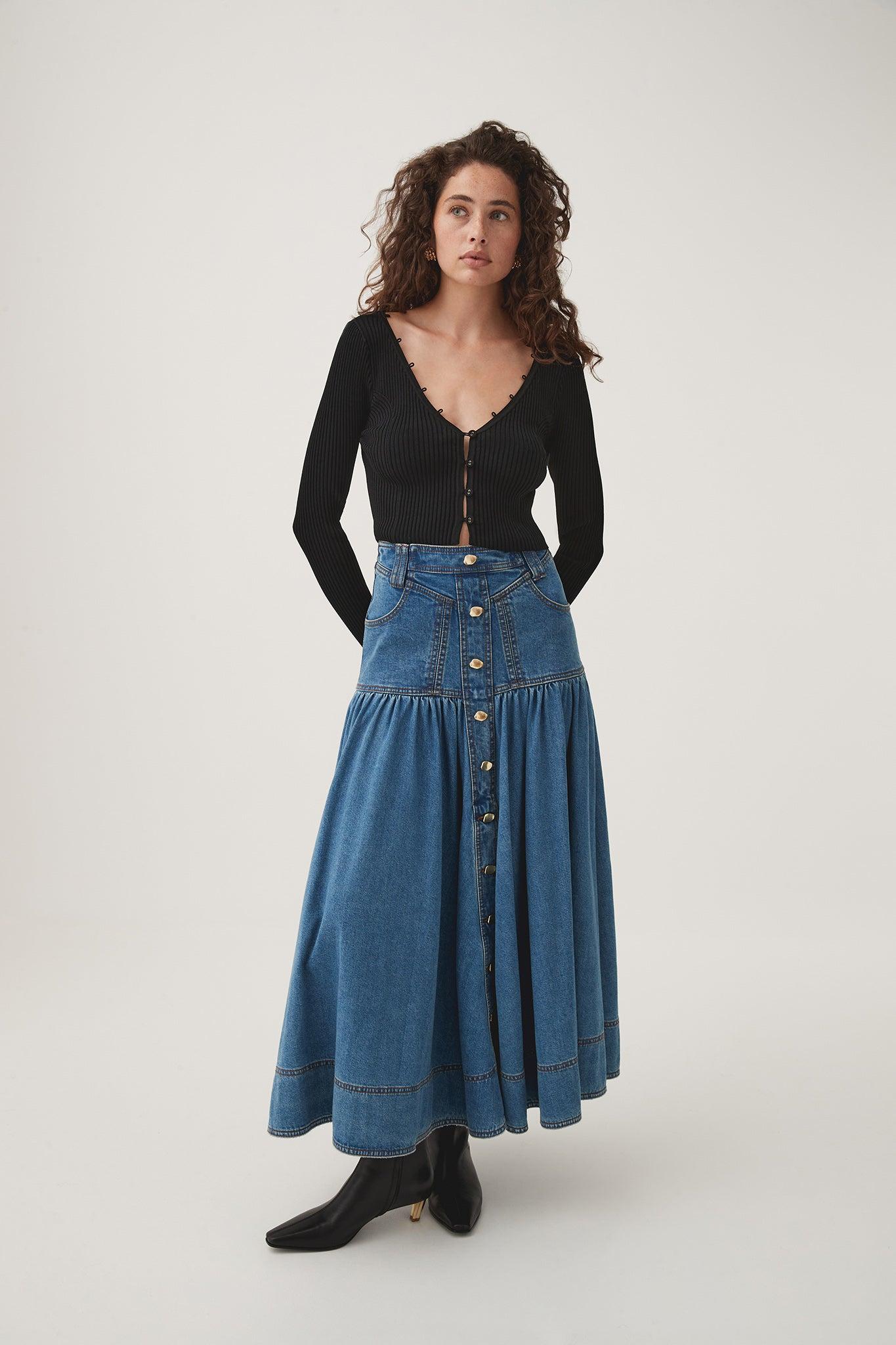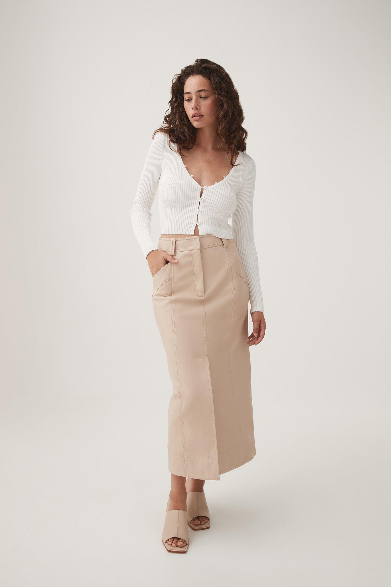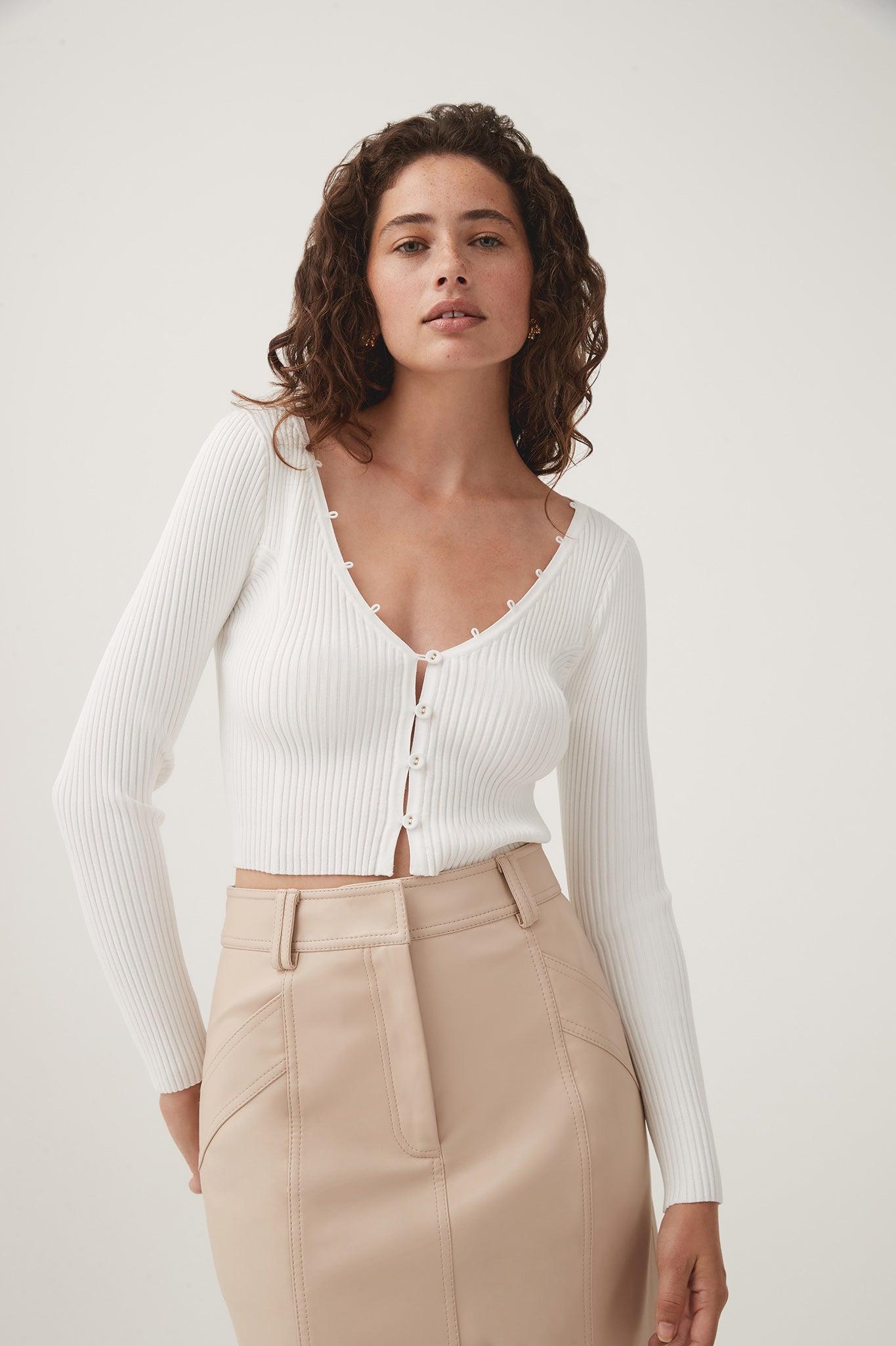 PRODUCT DETAILS Cropped rib knit cardigan V-neckline with rouleau loop detailing Centre front eyelet buttons Long sleeves Shop All Knitwear & Jumpers SIZE AND FIT Model wears a size AU 8/S Model: 175cm/ 5’9 Bust: 82cm Waist: 62cm Hips: 89cm We recommend going down a size for a fitted finish FABRICATION 65% Rayon 35% Nylon Delicate Cold Hand Wash Separately With Mild Wool Detergent