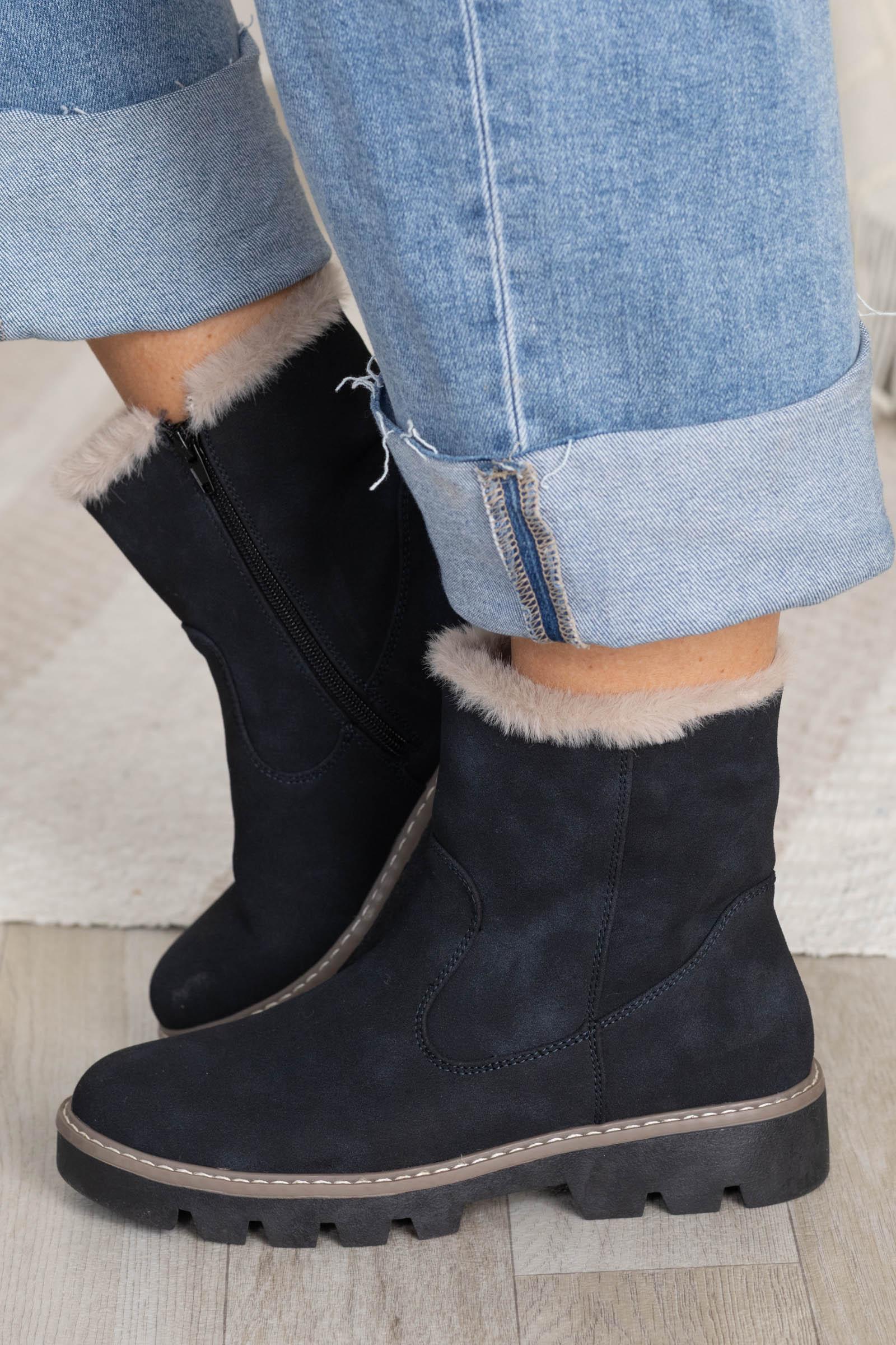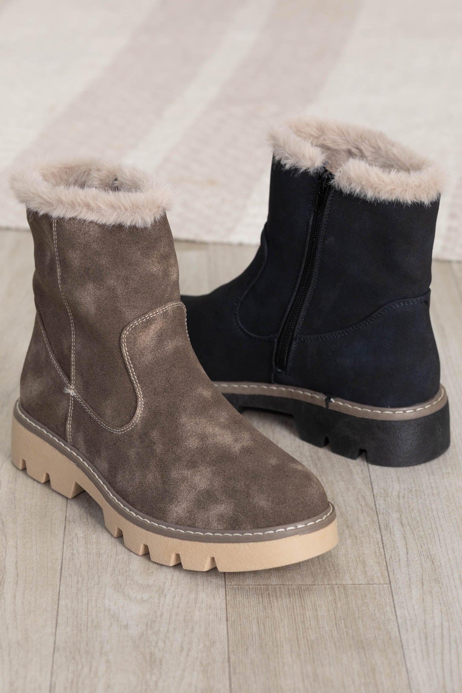 Style: Lug Sole Boot Brand: Very G Zipper: Inside Zipper Texture: Faux Fur Interior Heel: 1.25" Heel Colors: Black, Beige Fur/ Taupe, Beige Fur Print: Solid with Faux Fur Heel: 1.25" Heel Our Team Size Recommendation: We recommend true to size.