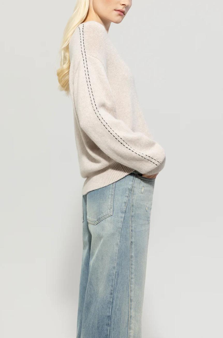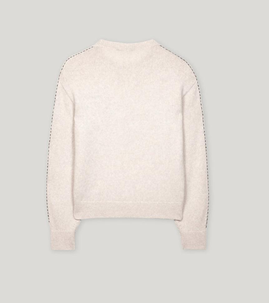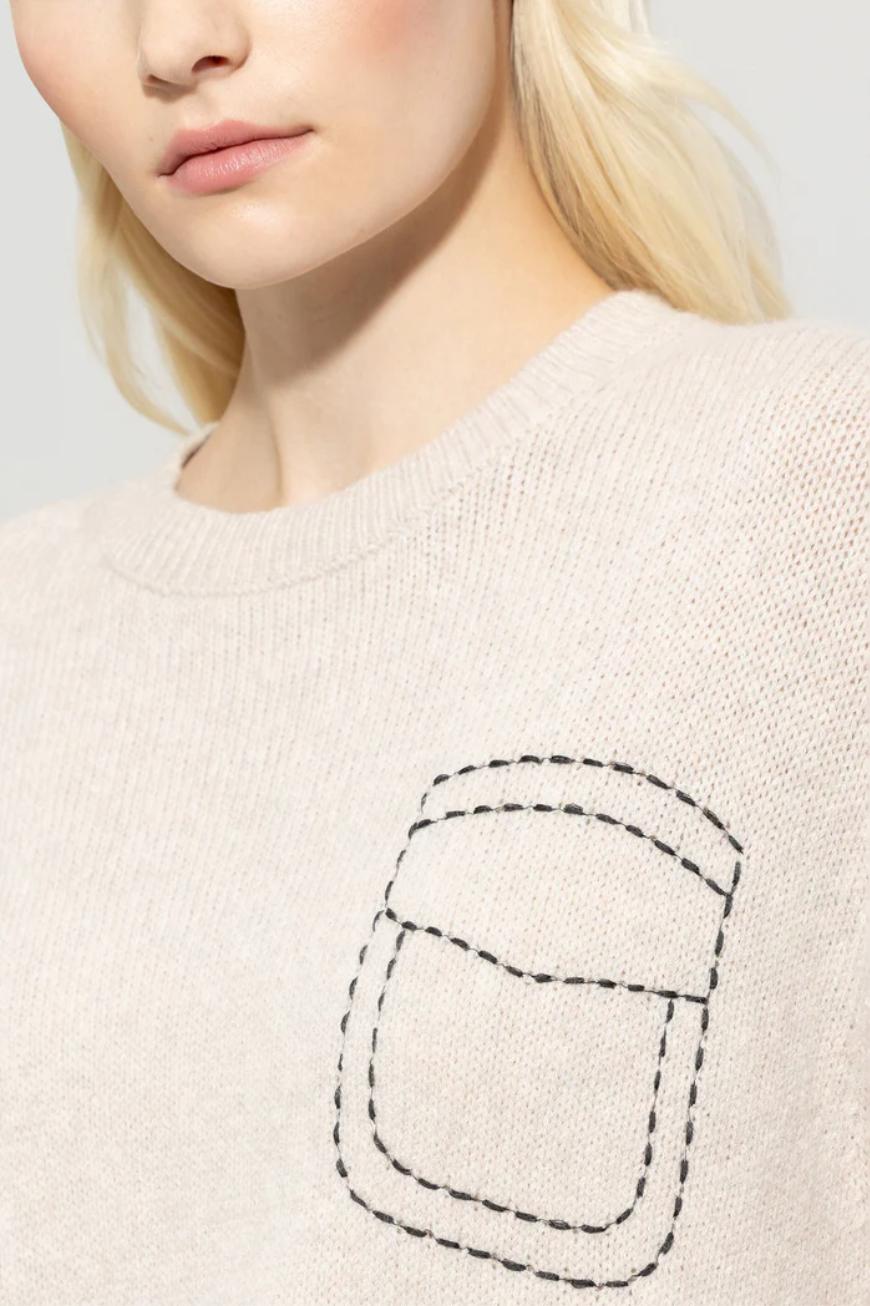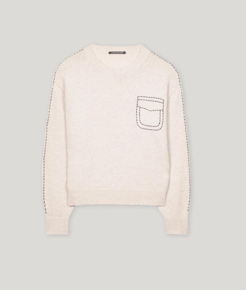 Knitted sweater made from high-quality, Italian lightweight yarn with a very soft feel and ribbed cuffs. Embroidered details indicate a breast pocket and stitching on the sleeves.Outer fabric: 52% wool, 35% alpaca, 13% polyamideHand wash