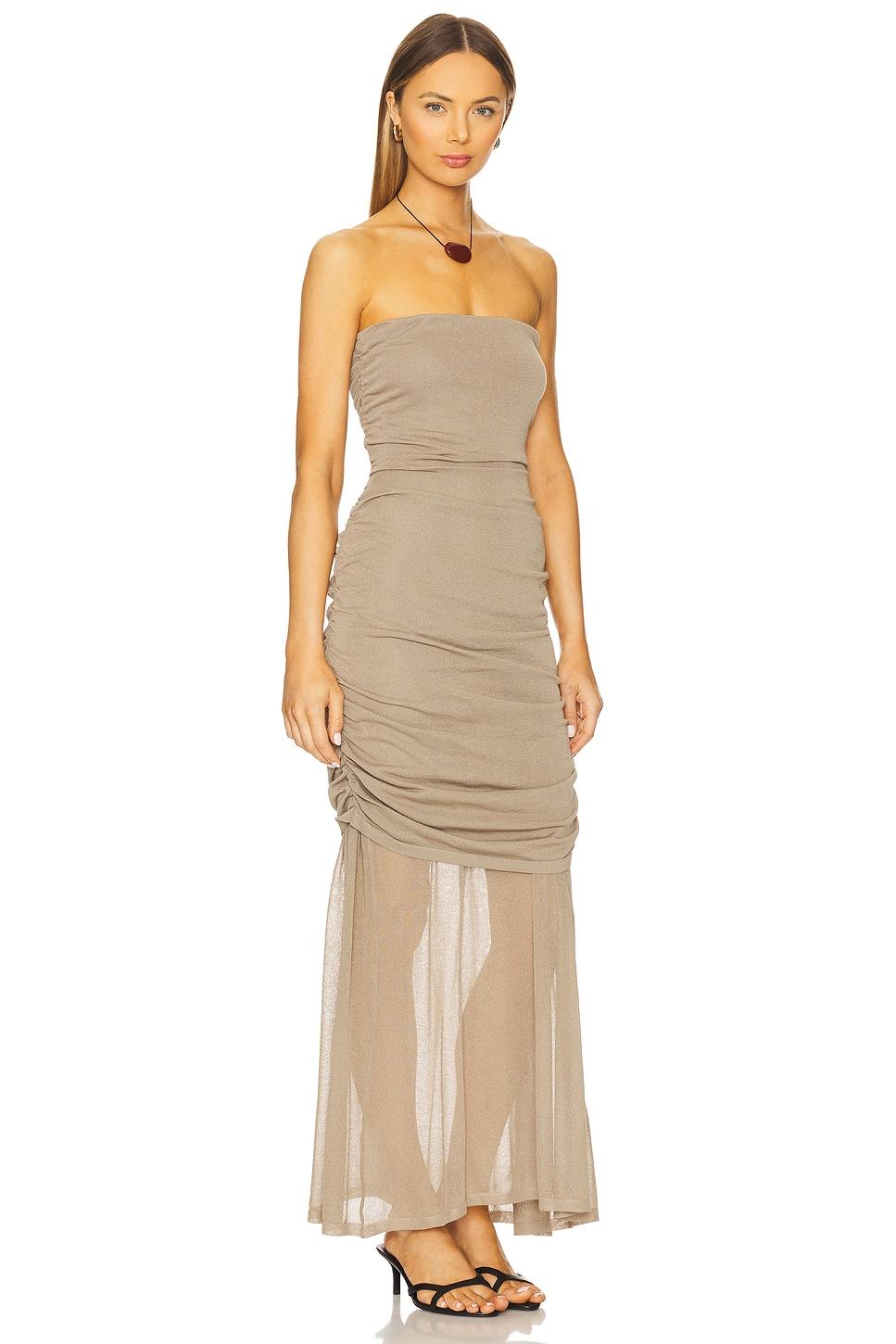 80% rayon, 20% nylon. Machine wash cold. Partially lined. Pull-on styling with elastic overbust band. Ruched seams. Midweight fully fashion knit fabric. Neckline to hem measures approx 52.5" in length. Made in China. Revolve Style No. SMAD-WD295. Manufacturer Style No. XP208126.