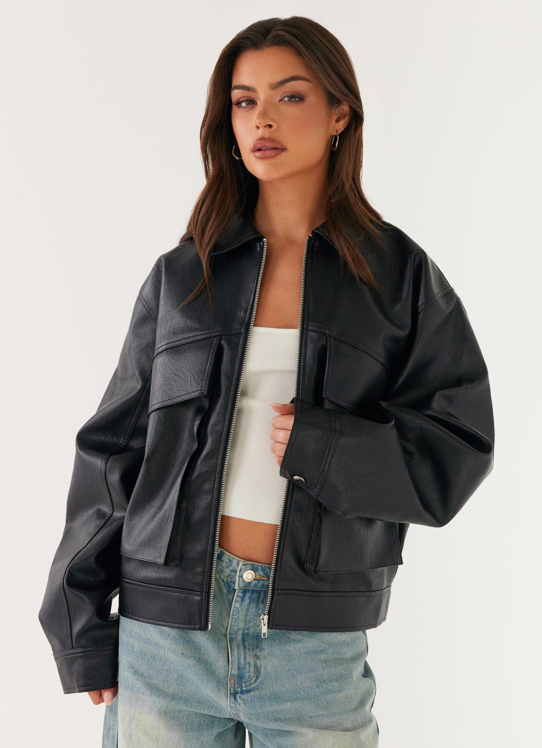 Peppermayo Exclusive The Lula Faux Leather Bomber Jacket is the perfect mix of edgy and chic. Featuring a single collared neckline and fully lined design, it offers a sleek, polished look. - Single collared neckline- Front metal zipper- Fully lined- Front twin flap pockets- "60% Polyester, 40% PU"- Lining: 100% Polyester Size AU 8 / US 4 garment measurements: Bust: 128cm / 50.4inHem: 110cm / 43.3inSleeve length: 65cm / 25.6inLength: 63cm / 24.8in Olivia is 170cm and wearing a size AU 8 / and US 4