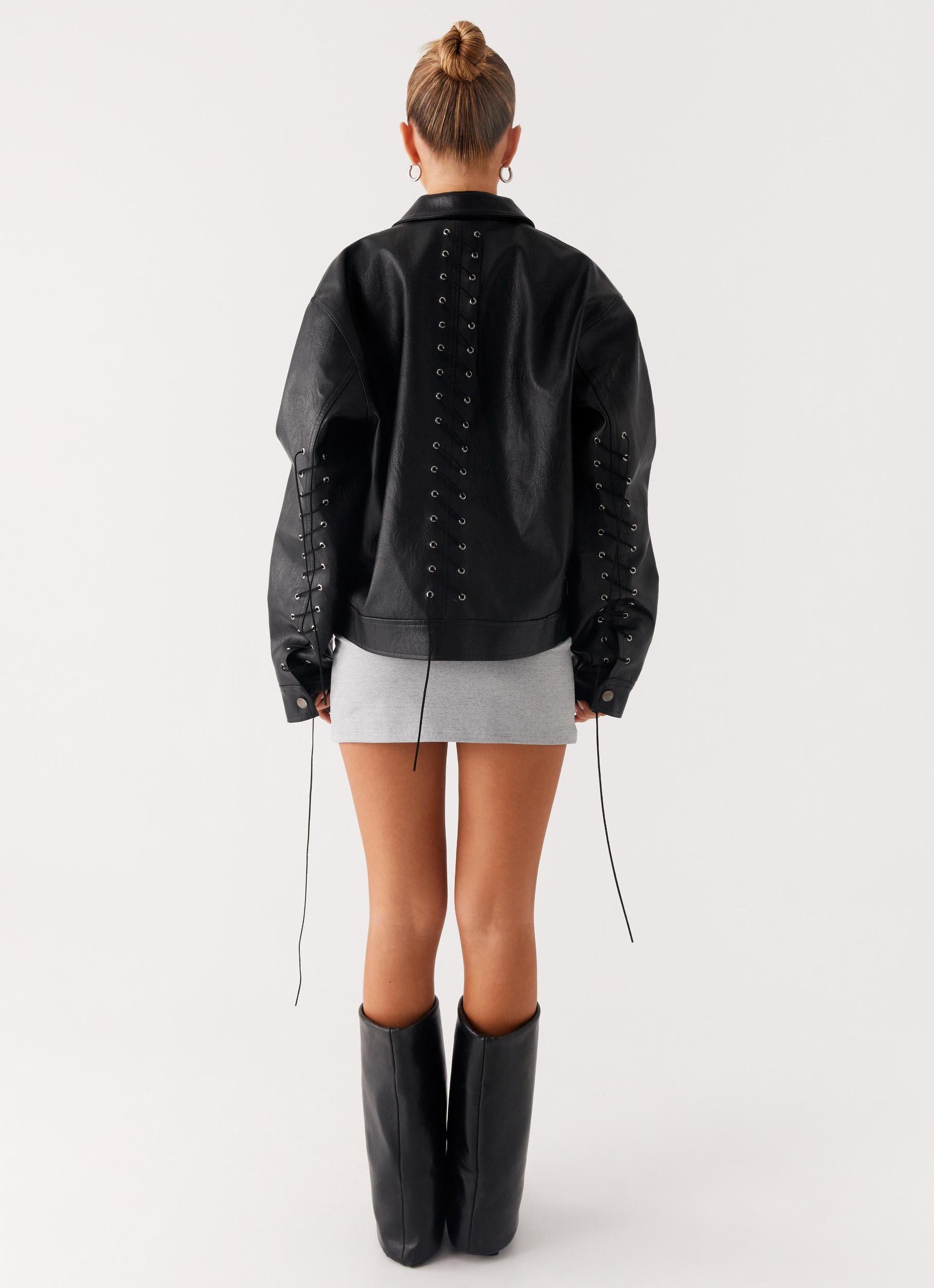 Peppermayo ExclusiveThe Lula Tassle Faux Leather Bomber Jacket brings attitude to any after-dark look. Featuring a single collared neckline and boxy silhouette, it’s finished with bold corset-style tie detailing along the back and sleeves. Throw it on—this jacket does all the talking.- Single collared neckline- Front zipper- Front twin flap pockets- Boxy fit- Back and sleeve corset tie detailing- Fully lined- Fabric: 60% polyester, 40% polyurethane- Lining: 100% polyesterSize AU 8 / US 4 garment measurements:Bust: 128cm / 50.4inHem: 110cm / 43.3inLength: 63cm / 24.8inYasmin is 174cm and wearing a size AU 6 / US 8