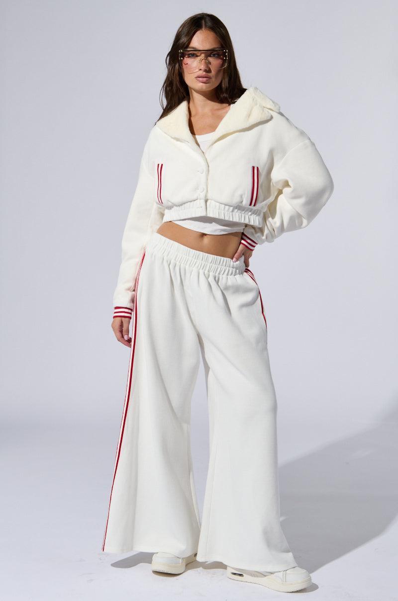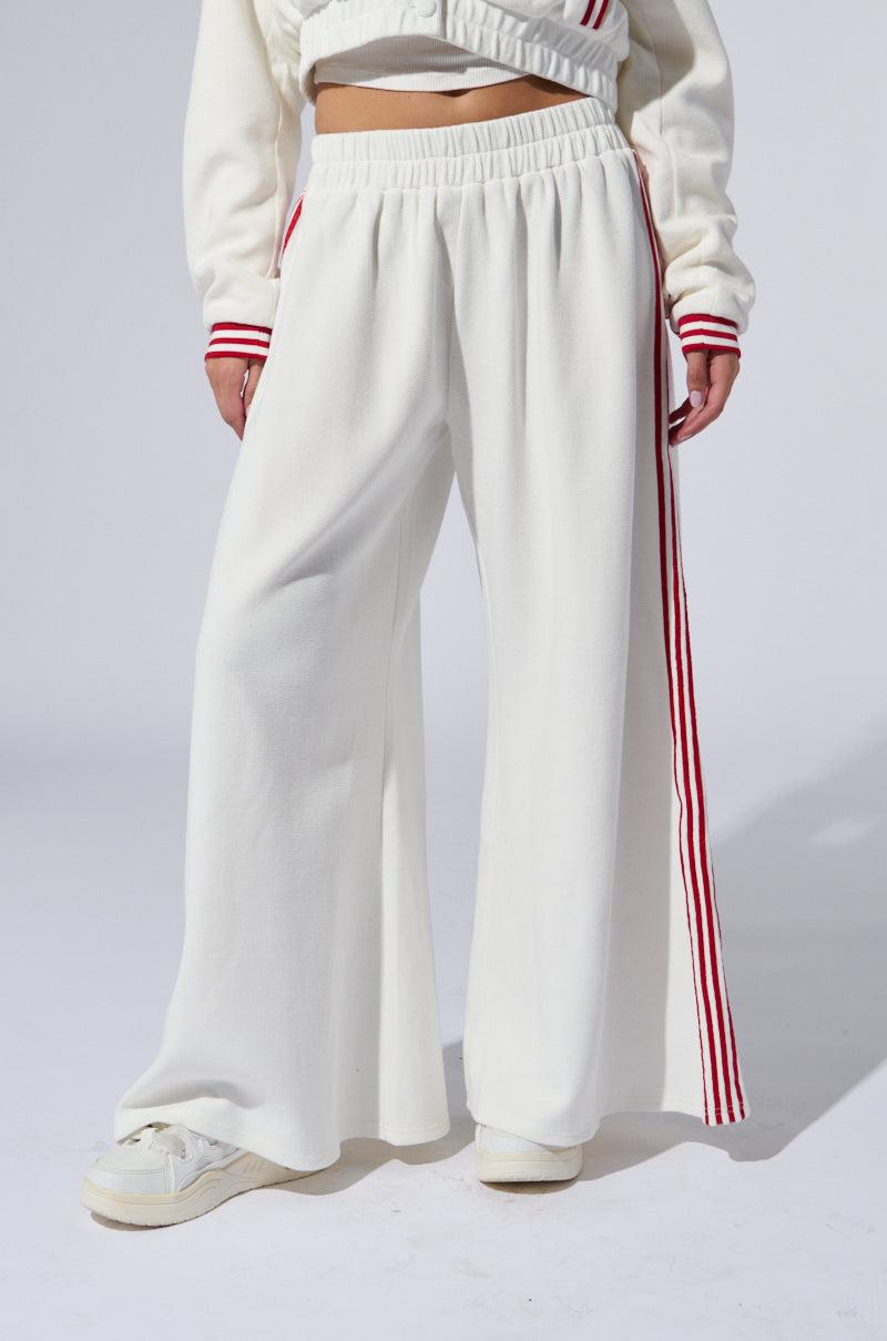 Live your Sporty Spice fantasy in The AKIRA Label Lula Waffle Knit Pants. These casual cuties are crafted from a soft, semi-stretchy waffle knit fabrication and boast a high-rise, wide-leg silhouette, a stretchy, elasticized waistband, and four red, varsity-inspired stripes on each pantleg that run from waist to hem. Wear them with the matching Lula Waffle Knit Bomber and chunky sneakers for a coordinated look from head to toe. - 64% Polyester, 34% Cotton, 2% Spandex- Some Stretch- Imported (all measurements approximate from size small) - 39” Waist to Hem- 27” Inseam- 12” Rise- Model is 5’9” and wearing a size smallProduct ID: 429181 (all measurements approximate from size 1X)- 41” Waist to Hem- 28” Inseam- 13” RiseProduct ID: 429185
