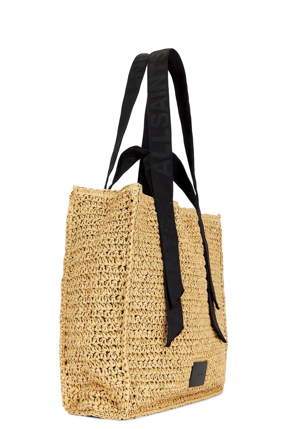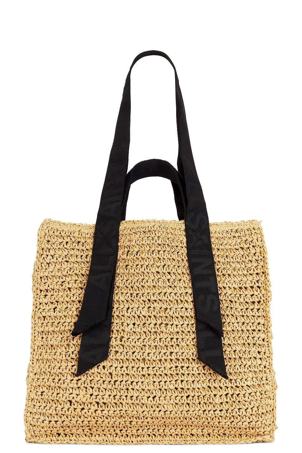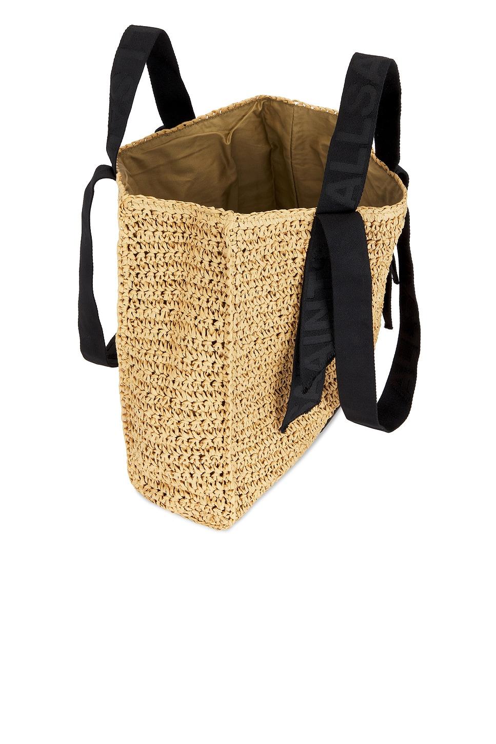 Raffia exterior with twill lining. Made in China. Open top. Webbing straps with tonal logo detail. One main compartment. Front logo detail. Measures approx 14.5" W x 14.5" H x 5.15" DShoulder strap with a 12" dropTop handle with a 4.5" drop. This item is not available to ship to Australia. Revolve Style No. ALLR-WY155. Manufacturer Style No. W081XA.