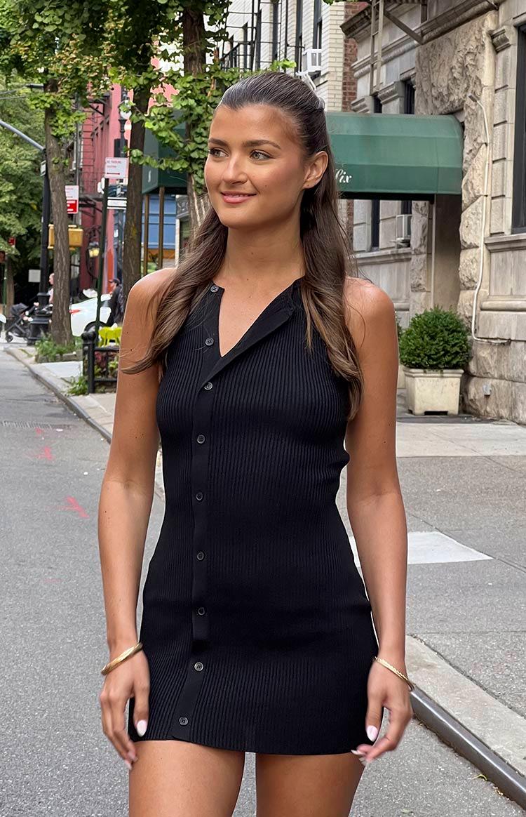 Black Button Up Mini DressHow to style:Your new favourite LBD has arrived! Radiate class in this luxe elevated mini that is anything but basic. Featuring a unique asymmetric button front design and flattering bodycon style, the Lumi mini dress is perfect for drinks and cocktails! Style with your favourite heels and gold jewellery for an elegant look!Features: Mid weight material Mini length Sleeveless style Button down front Lots of stretch Unlined Bodycon fit High crew neckline