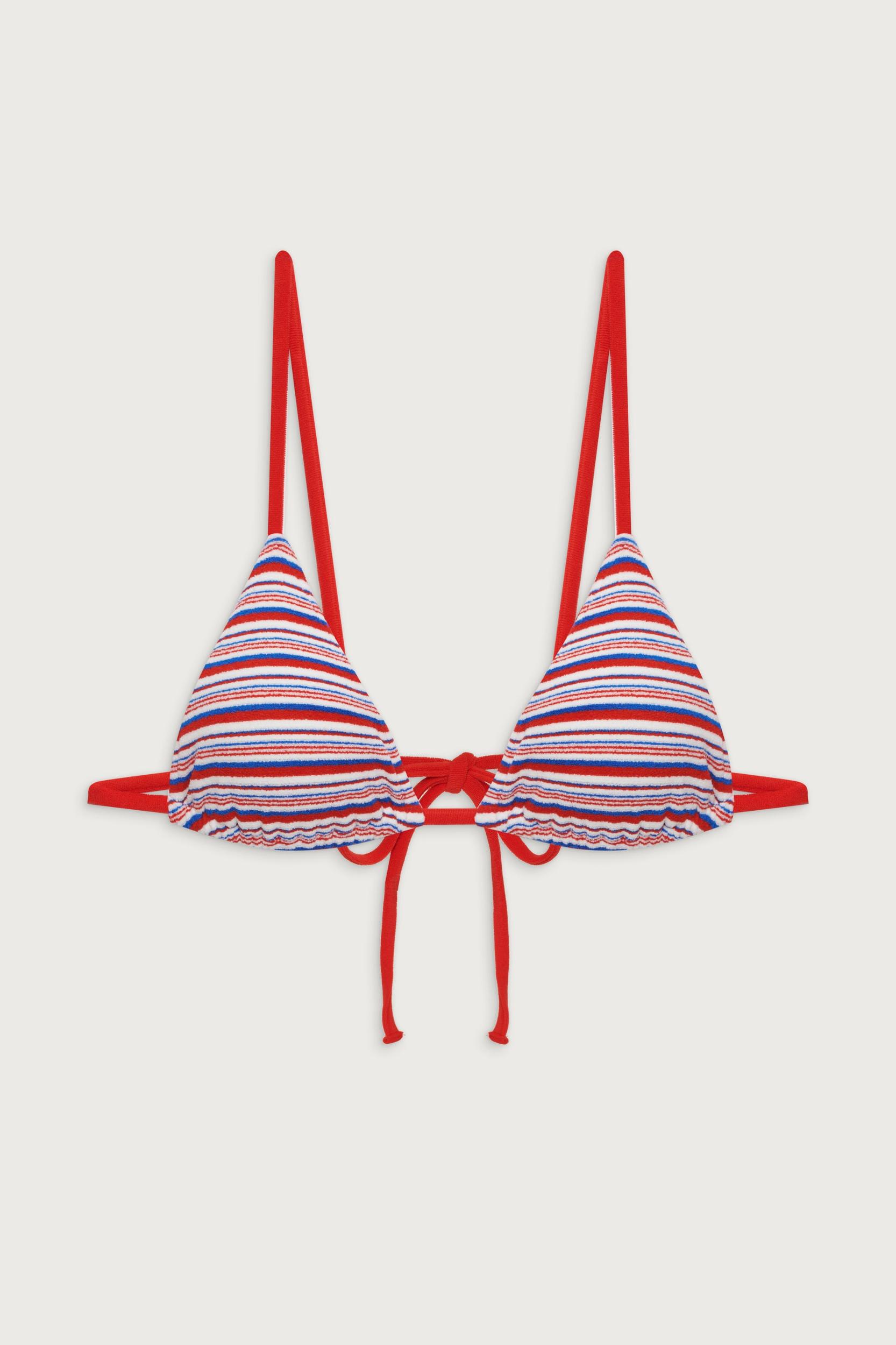 Meet the Lumia bikini top, a classic addition to your swimwear collection. This skimpy triangle shape features adjustable over-the-shoulder ties, ensuring a customizable and comfortable fit. Designed with a new American Summer striped print and plush terry cloth fabric, the Lumia bikini top is sure to add a splash of color to your beachside ensemble. Fabric 96% Nylon + 4% Spandex Terry Swim Adjustable Shoulder Straps and Back Tie Model Size & Fit This style runs true to size Britain is wearing a size Small Height 5’8” (173cm) Bust 34" (86cm), Waist 25" (64cm), Hips 35.5" (90cm)