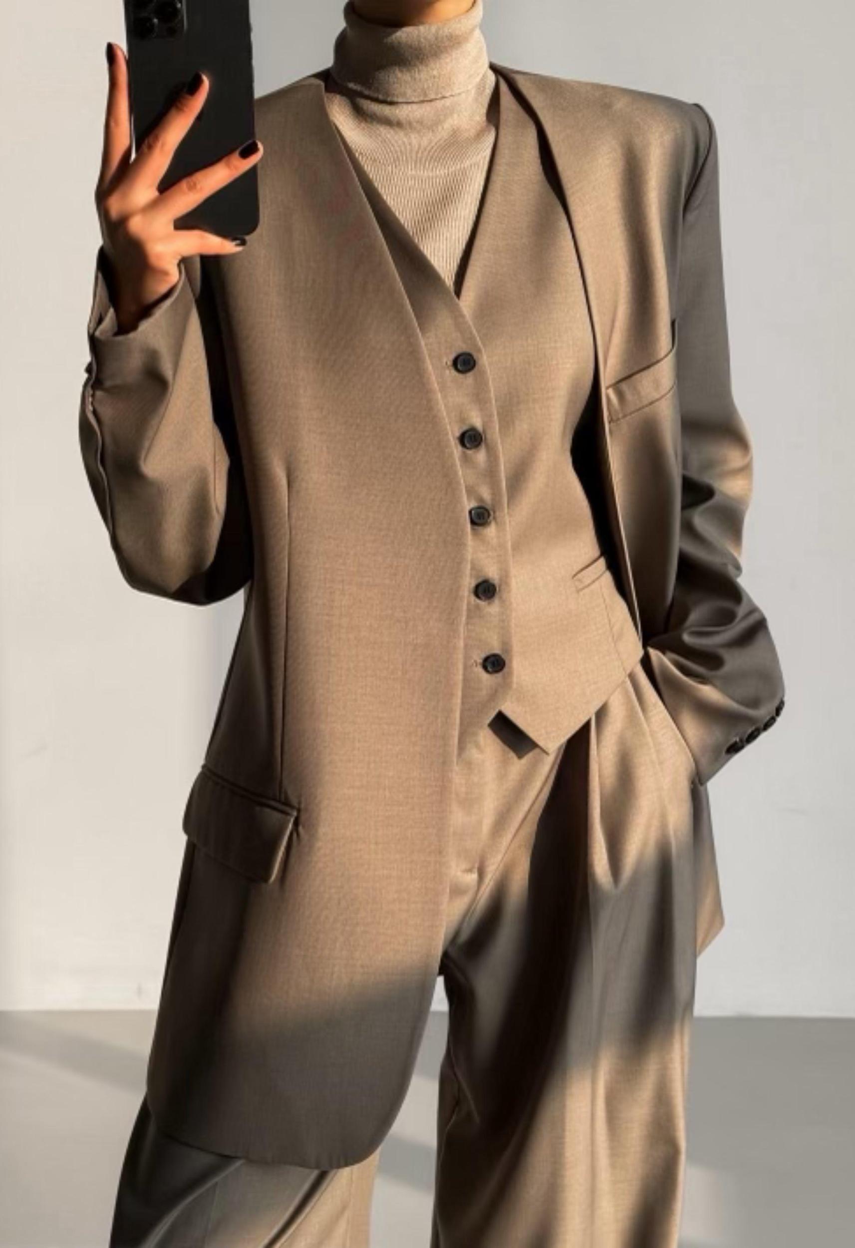 Sizes : XS/S and M/L Color: Taupe Button Up Vest 70% Polyester 30% Wool Dry Clean By The NKC Store Product Measurements: XS/S Bust: 81.28cm / 32in Length: 48.26cm / 19in M/L Bust: 91.44cm / 36in Length: 50.8cm / 20in Model is 177cm / 5'10" wearing Size O/S