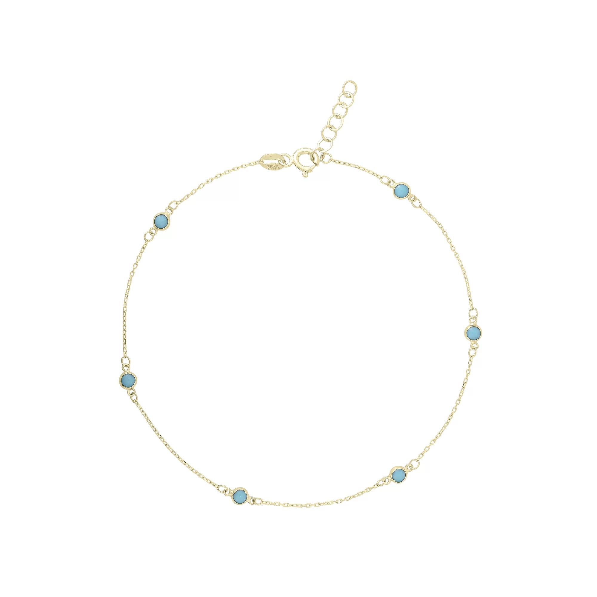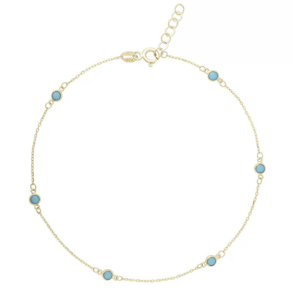 Add a touch of color to your ensemble with this LUMINOR GOLD 14k gold turquoise anklet. Add a touch of color to your ensemble with this LUMINOR GOLD 14k gold turquoise anklet. Length: 9 in. Metal: 14k gold Plating: 14k gold Finish: polished Packaging: velvety pouchSTONE DETAILS Stone type: turquoise Center stone size: 2.5 mm x 2.5 mm Shape: cabochon Setting: bezel Gemstones may have been treated to enhance their appearance. Special care may be required. Please visit our Gemstone Treatment & Special Care Guide for more information. Image(s) may be enlarged to show detail. Size: 9". Color: Yellow. Gender: female. Age Group: adult.