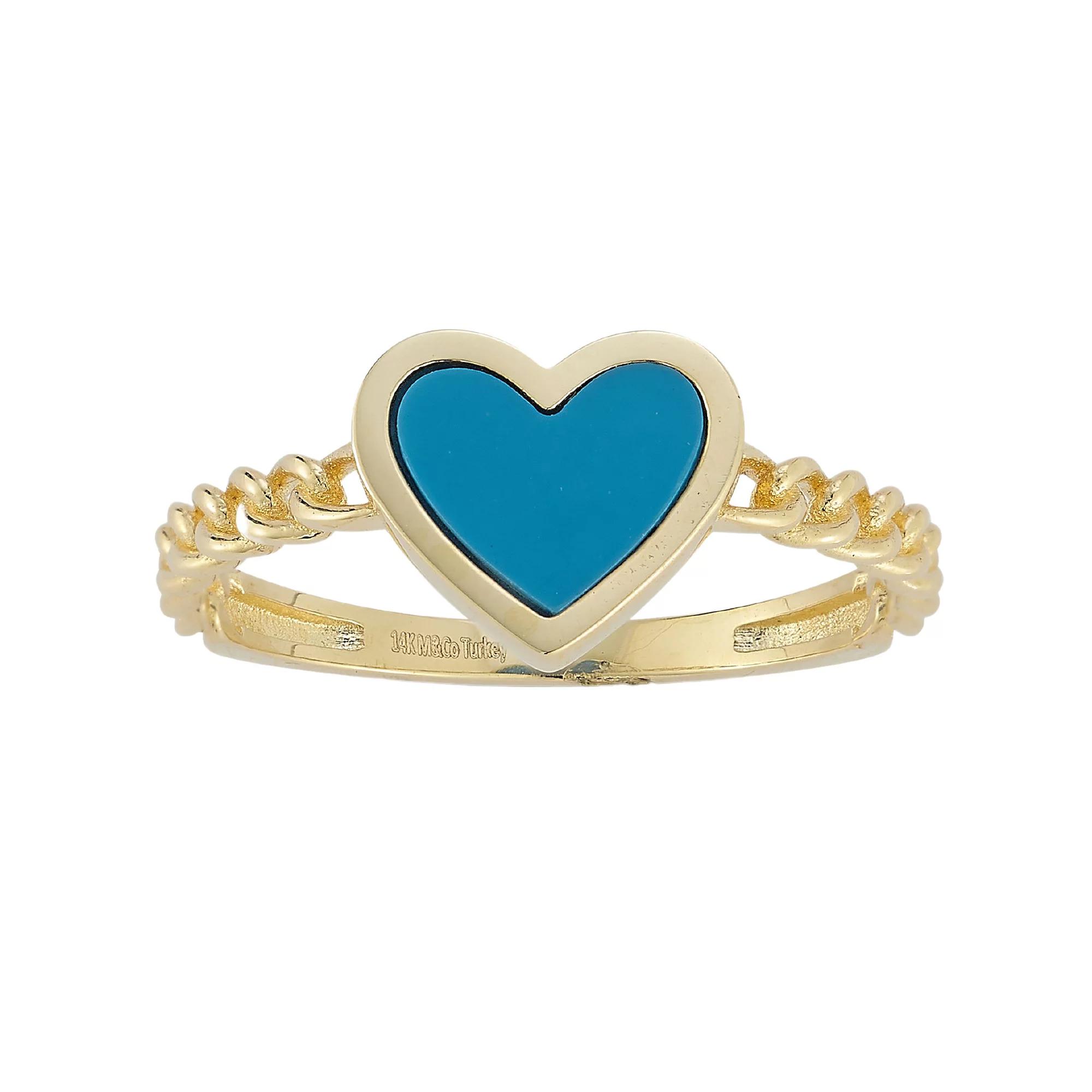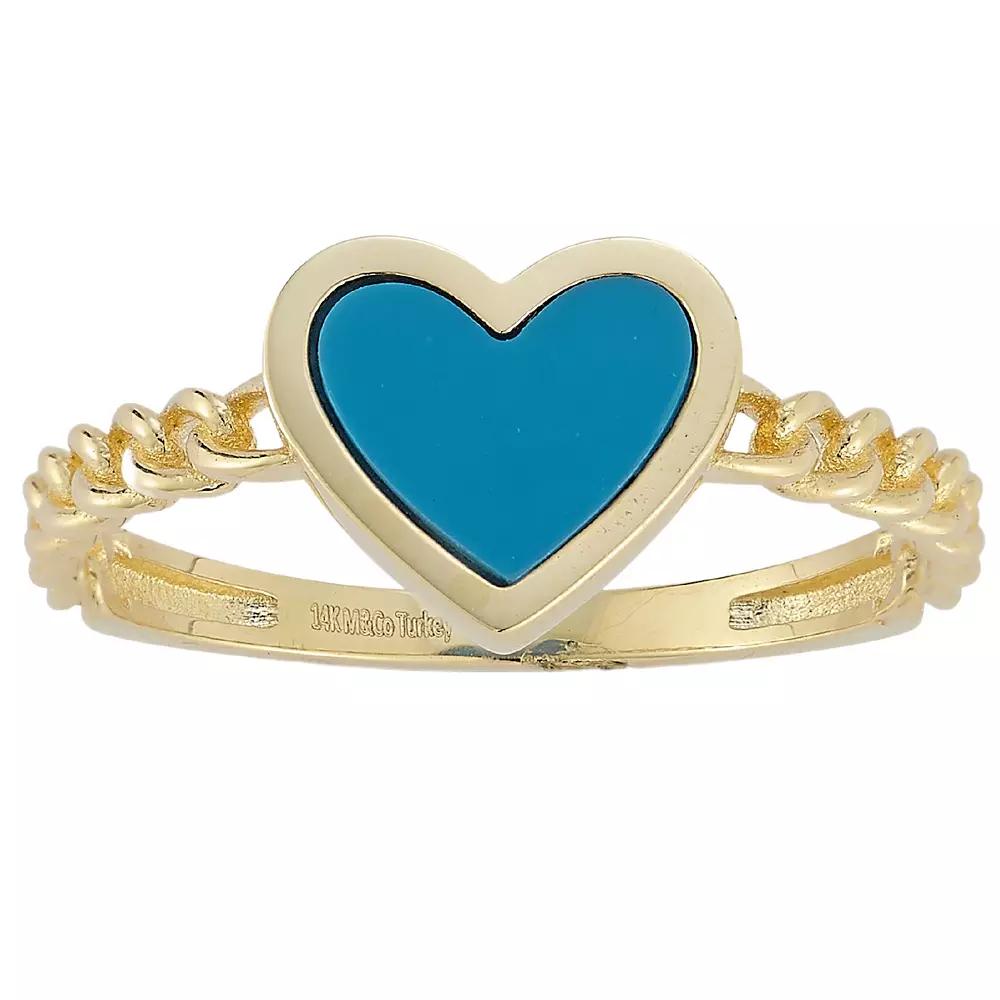 Accessorize in style with this LUMINOR GOLD 14k Gold Turquoise Heart & Curb Chain Ring. Click on this JEWELRY & WATCHES GUIDE to learn about fit, styles, materials and more! Accessorize in style with this LUMINOR GOLD 14k Gold Turquoise Heart & Curb Chain Ring. Click on this JEWELRY & WATCHES GUIDE to learn about fit, styles, materials and more! FEATURES Width: 2 mm Shank style: stackable Nickel free Metal: 14k gold Plating: 14k gold Finish: polished Packaging: velvety pouch ImportedSTONE DETAILS Stone type: turquoise Center stone size: 8 mm x 6 mm Shape: heart Setting: bezel Gemstones may have been treated to enhance their appearance. Special care may be required. Please visit our Gemstone Treatment & Special Care Guide for more information. Gender: female. Age Group: adult.