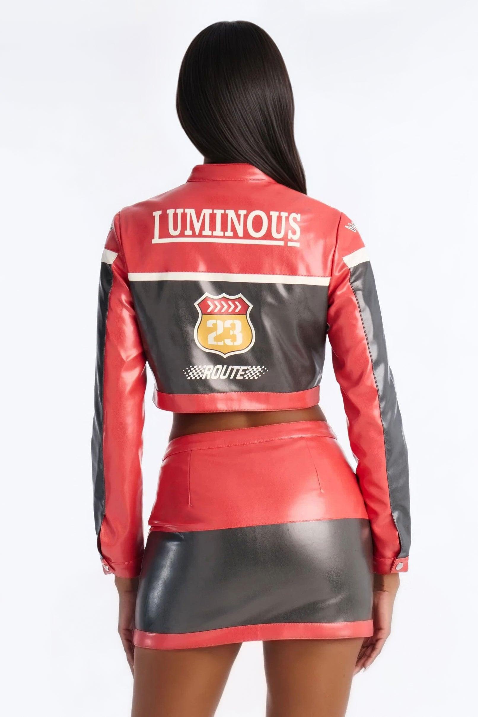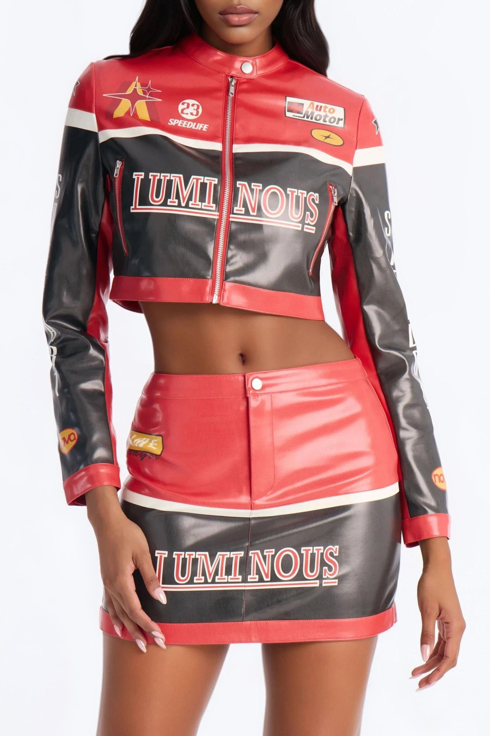 Available In Red/combo. 2 Piece Ensemble Jacket And Mini Skirt Set Moderate Stretch 14.5" Length Top And Skirt Lining Front Button And Zipper Skirt Closure Top and Bottom Self: 100% Polyester with Polyurethane Coating Top and Bottom Lining: 100% Polyester Imported California Proposition 65WARNING: Cancer and Reproductive Harm - www.P65Warnings.ca.gov.
