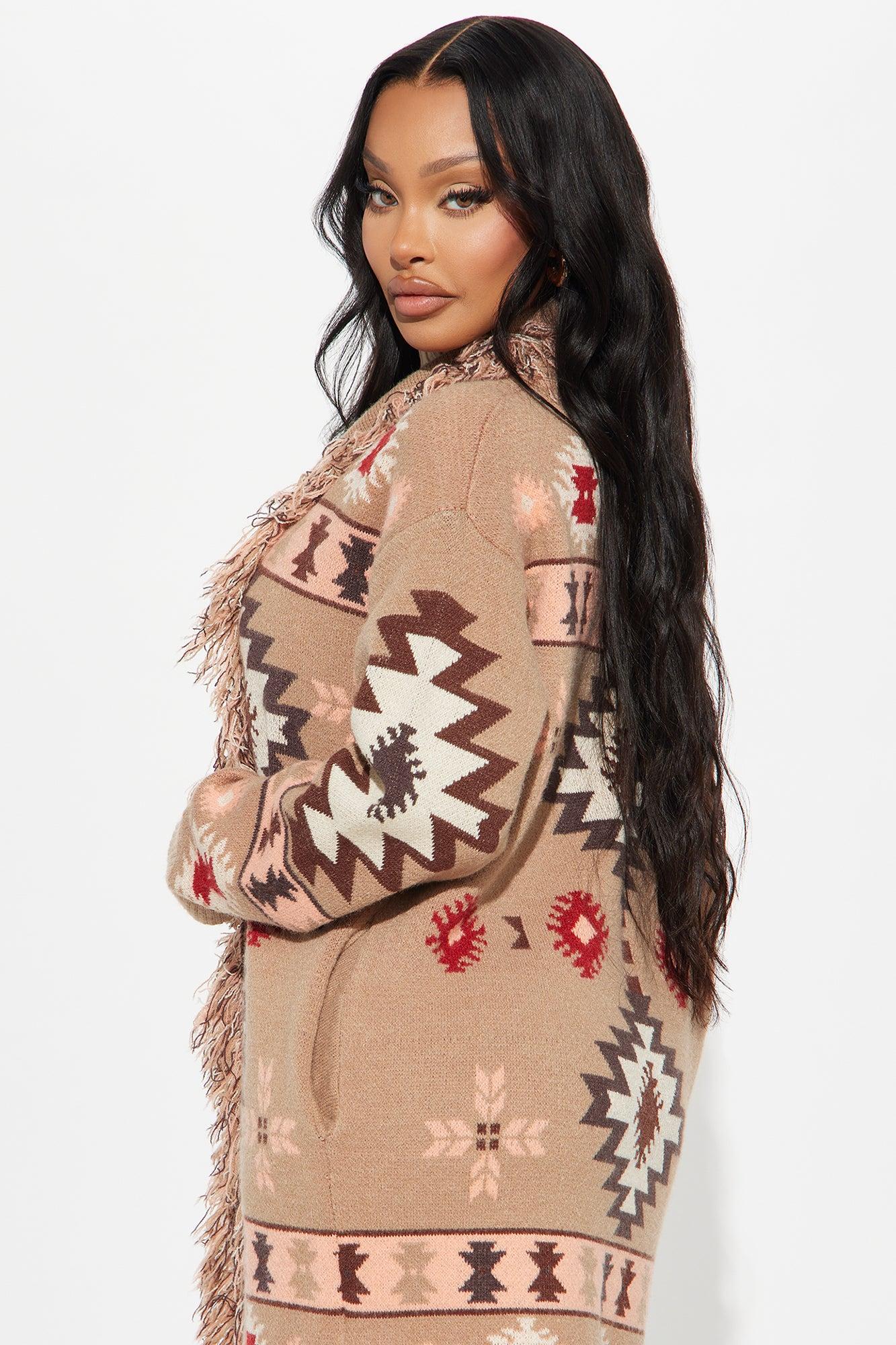 Available In Beige And Teal. Cardigan Sweater Printed Long Sleeve Open Front Fringe Trim Disclaimer: Print Placement May Vary 42% Acrylic 30% Polyester 28% Nylon Imported California Proposition 65 WARNING: Cancer and Reproductive Harm - www.P65Warnings.ca.gov.