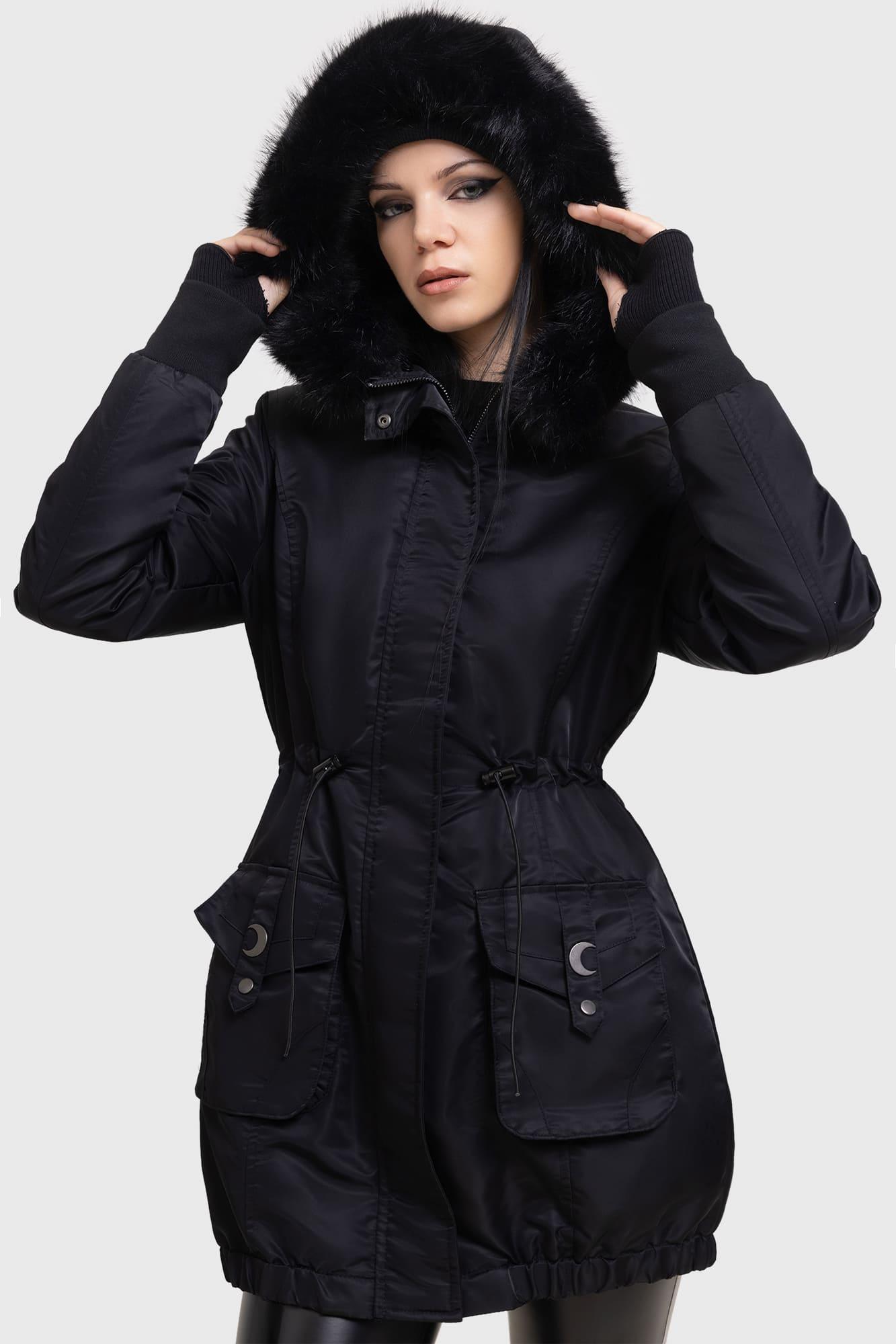 LUNAR ECLIPSE.- Smooth, waterproof fabric.- Long, cuffed sleeves.- Hood with detachable fur.- Adjustable toggle waist.- Elasticated hem.- Moon hardware details.- Outer pockets.- Quilted lining.- Front zip closure.- Fitted.With KILLSTAR branding, Shell fabric: 100% Polyamide, Lining : 98% Polyester 2% Elastane, Padding: 100% Polyester, Faux Fur: 100% Polyester, Trim 97% Polyester 3 % Elastane.Do not wash/ Do not bleach/ Do not tumble dry/ Do not iron/ Dry clean. Imported.