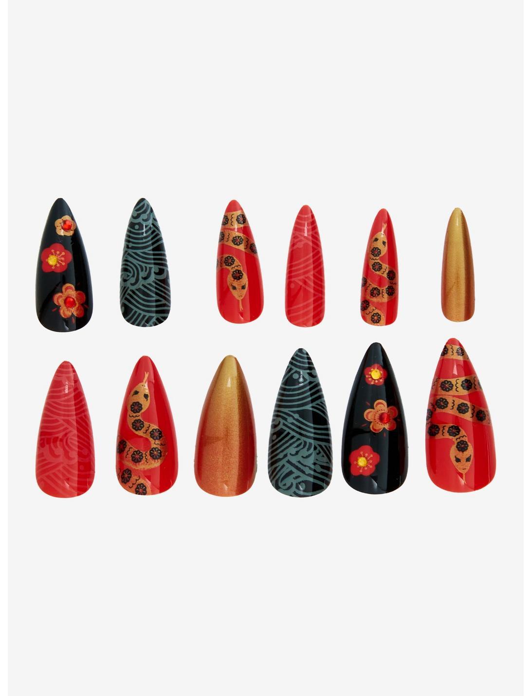 Keep your nails lookin' super prosperous this Lunar New Year with this press-on nail set! Featuring 24 nails with designs celebrating the Year of the Snake. Comes with nail glue.24 nailsPlastic; ethyl cyanoacrylateGlue tube includedCruelty-freeImported