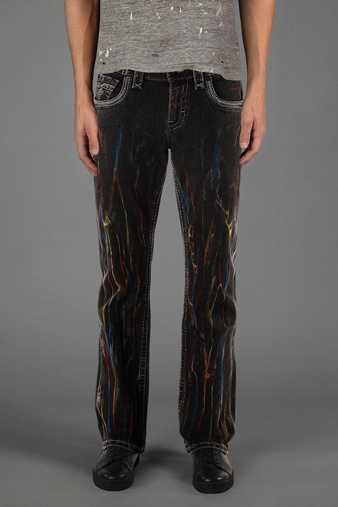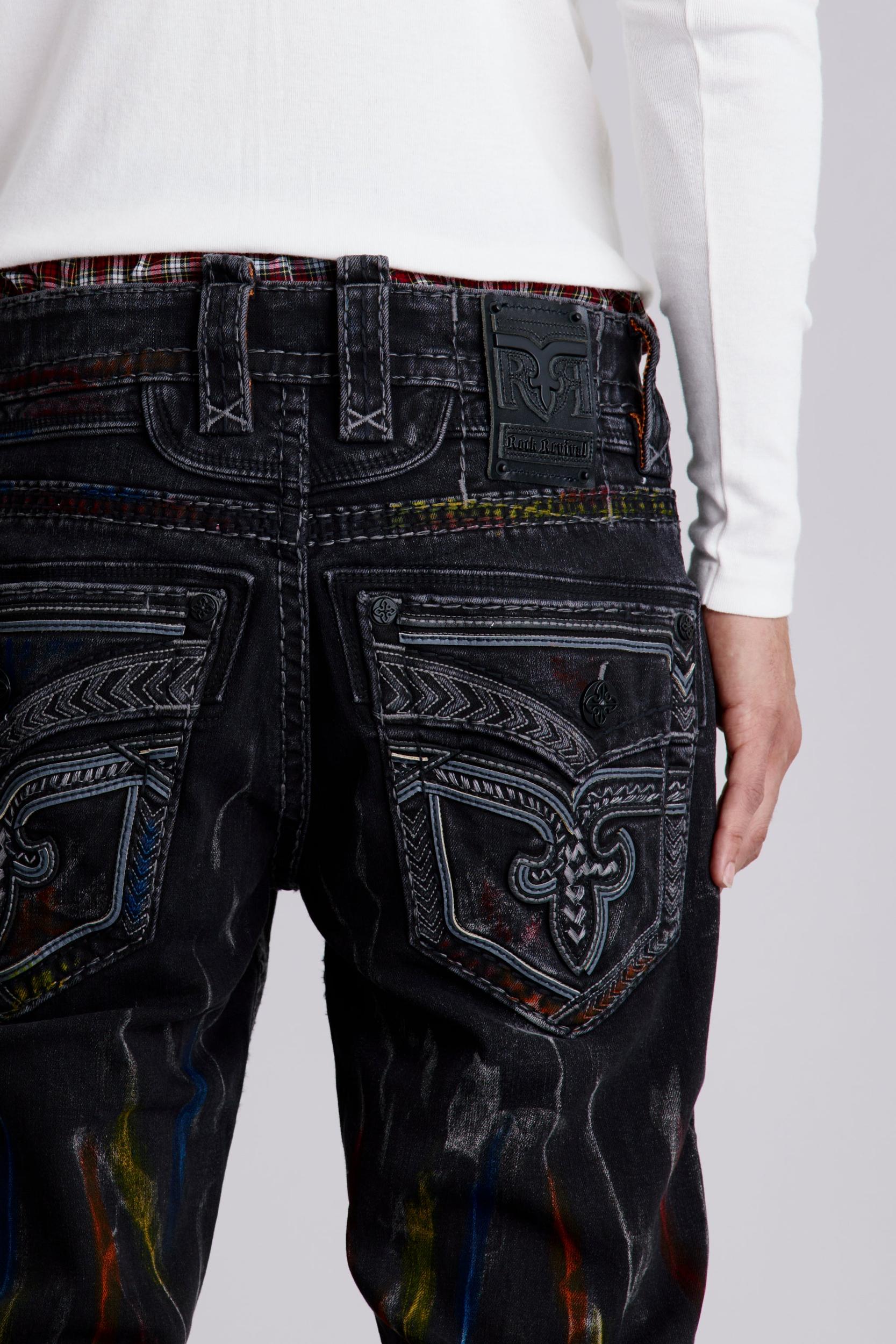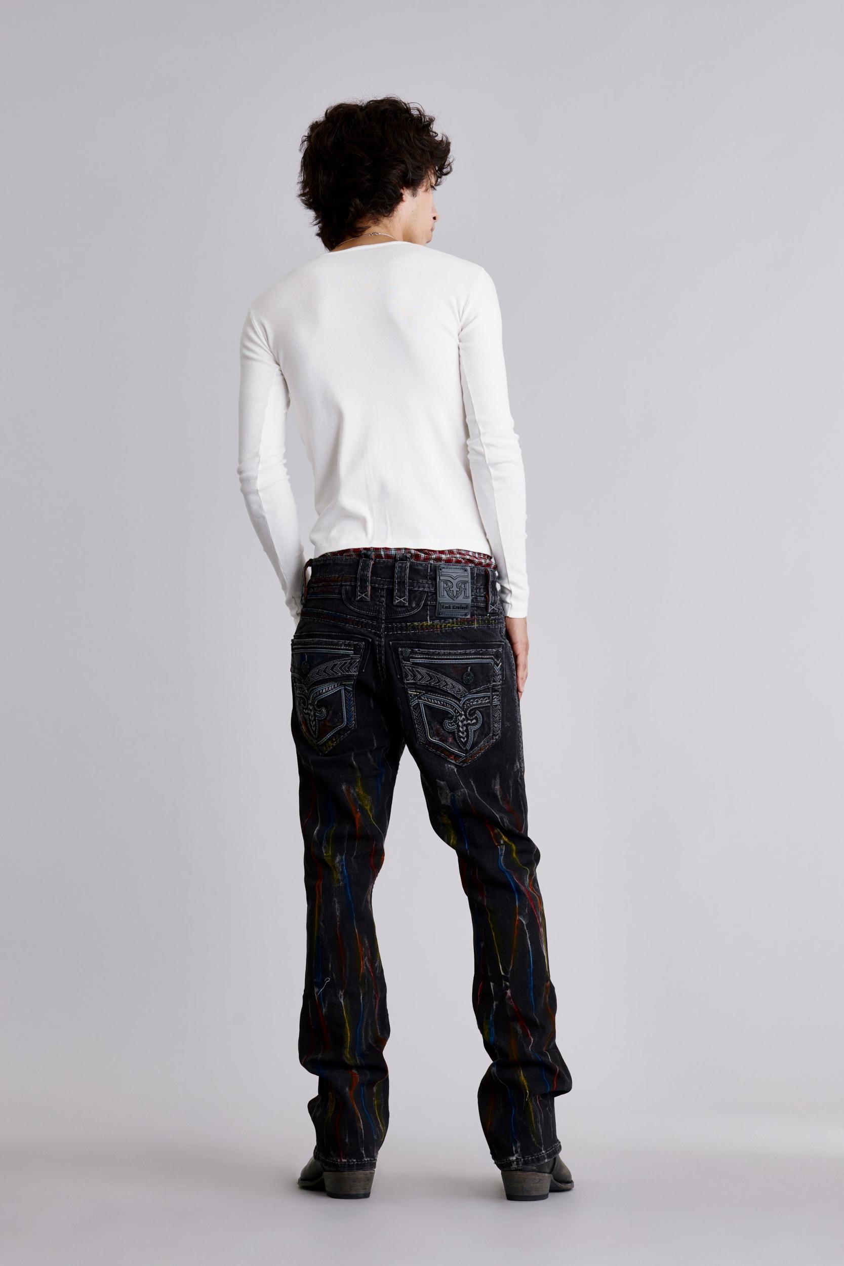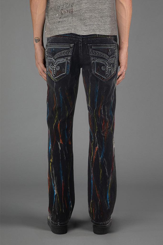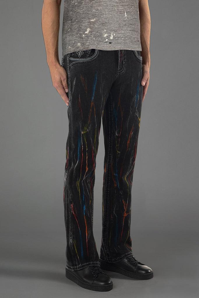 Matte black hardware throughout with multi-color paint. Classic reverse Fleur de Lis back pockets with chevron-style black and grey leather accents. Black leather belt loop patch. Designed with care and creativity in Los Angeles, California.