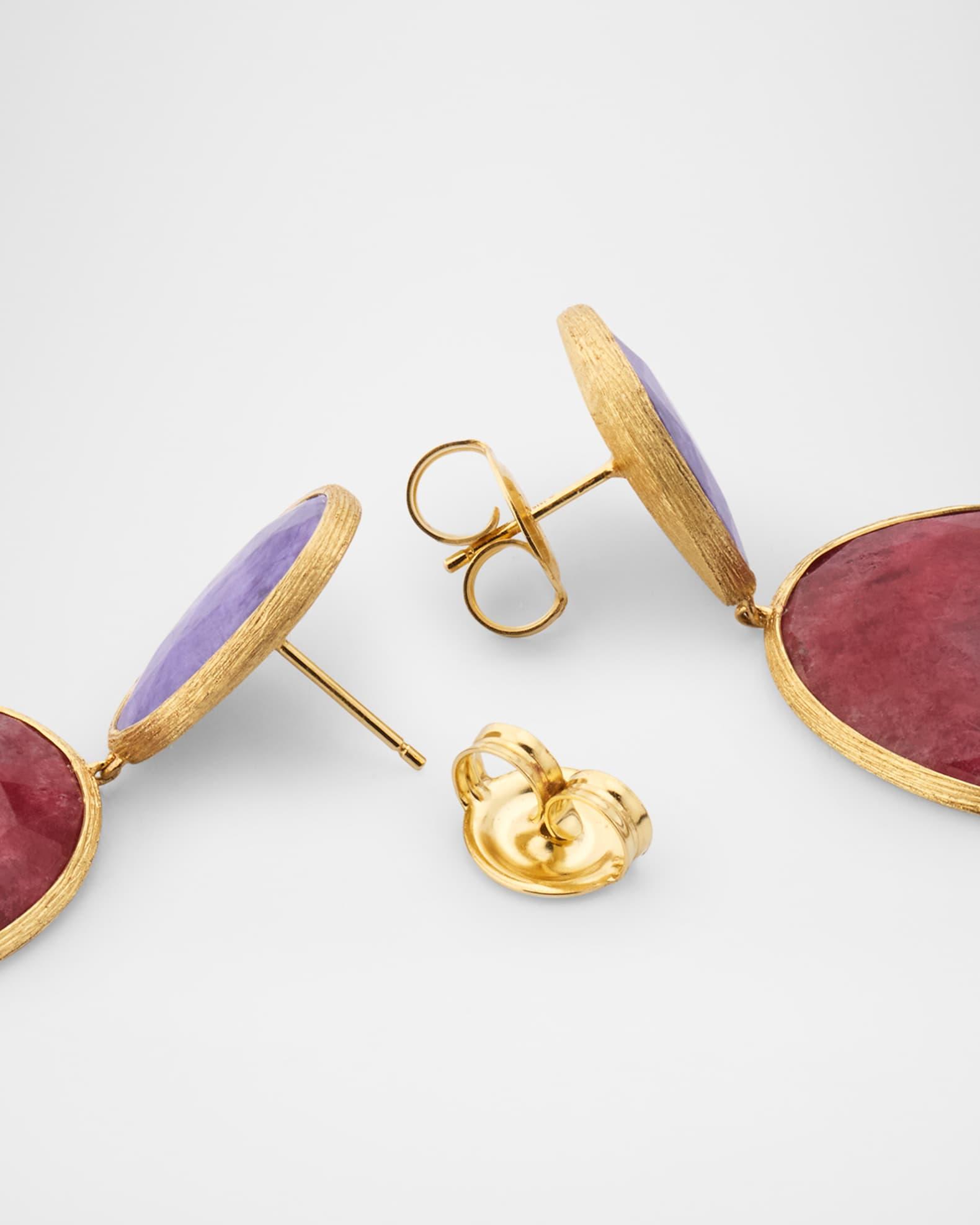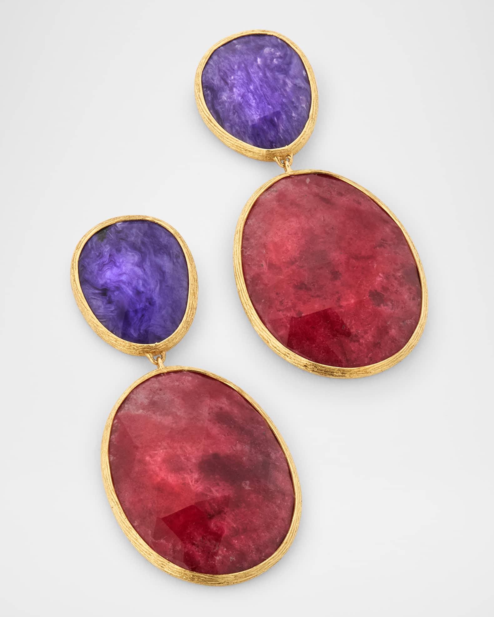 Marco Bicego earrings from the Lunaria Collection Hand-engraved 18-karat yellow gold Natural square faceted red thulite and purple charoite stones For pierced ears Professional cleaning recommended Made in Italy Please note: Each Marco Bicego piece is unique and actual stones used may vary.