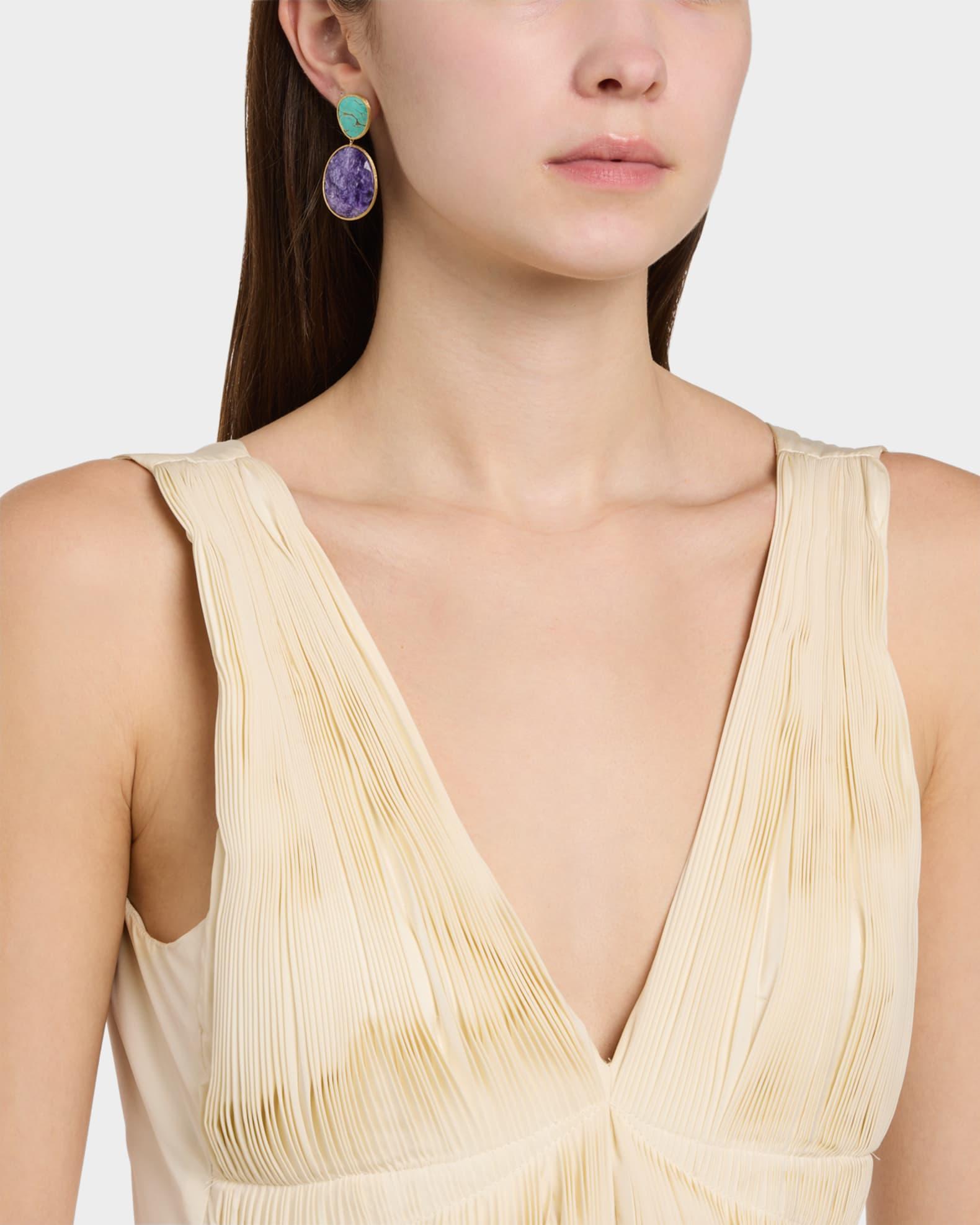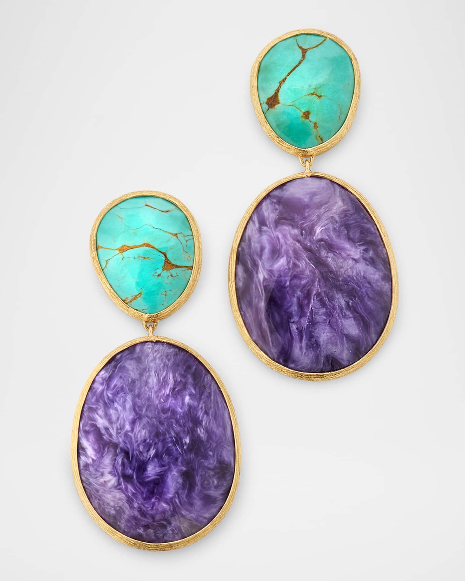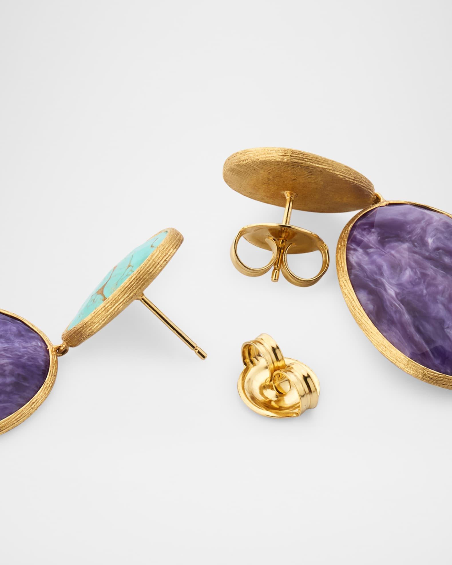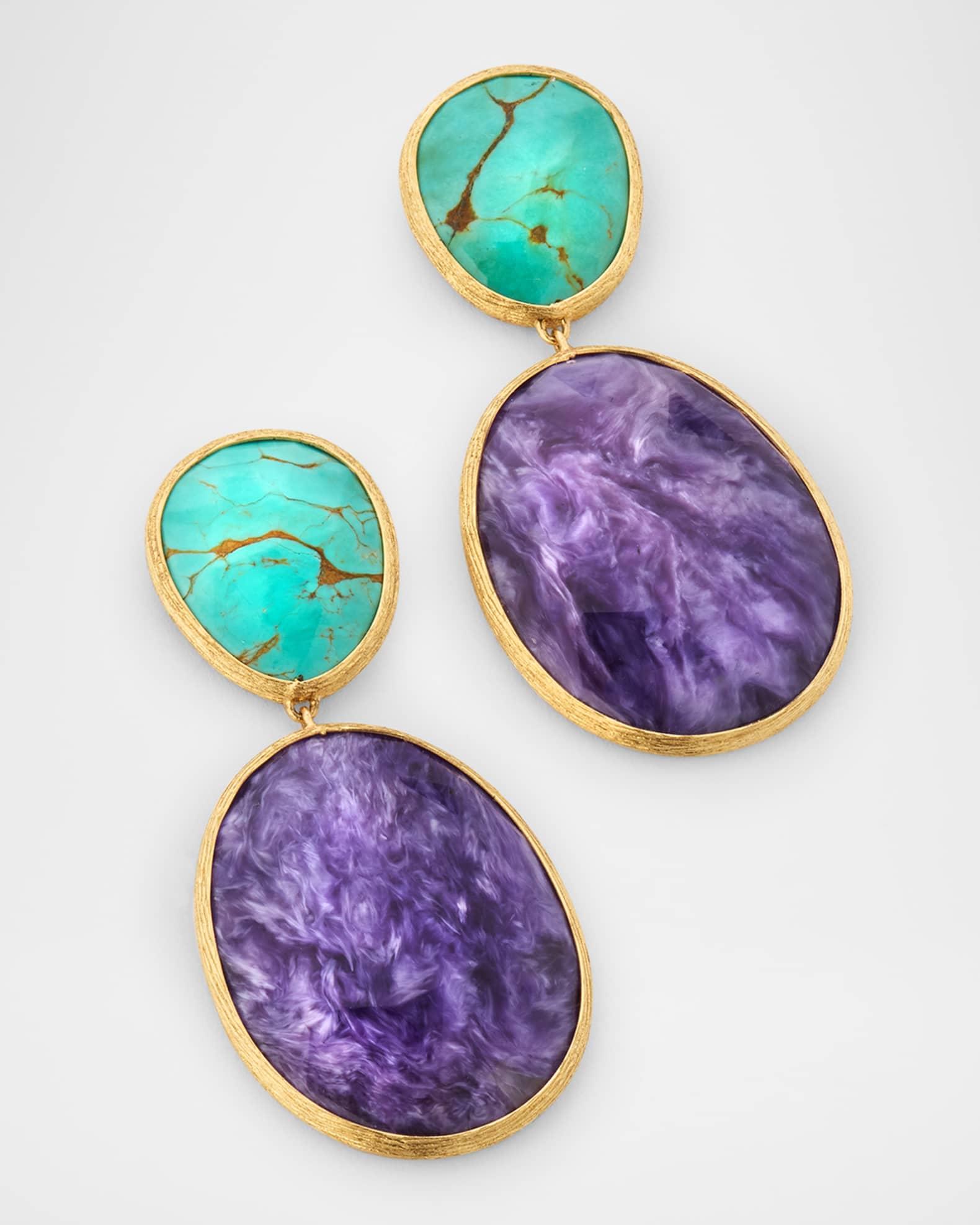 Marco Bicego earrings from the Lunaria Collection Hand-engraved 18-karat yellow gold Natural square faceted turquoise and purple charoite stones For pierced ears Professional cleaning recommended Made in Italy Please note: Each Marco Bicego piece is unique and actual stones used may vary.
