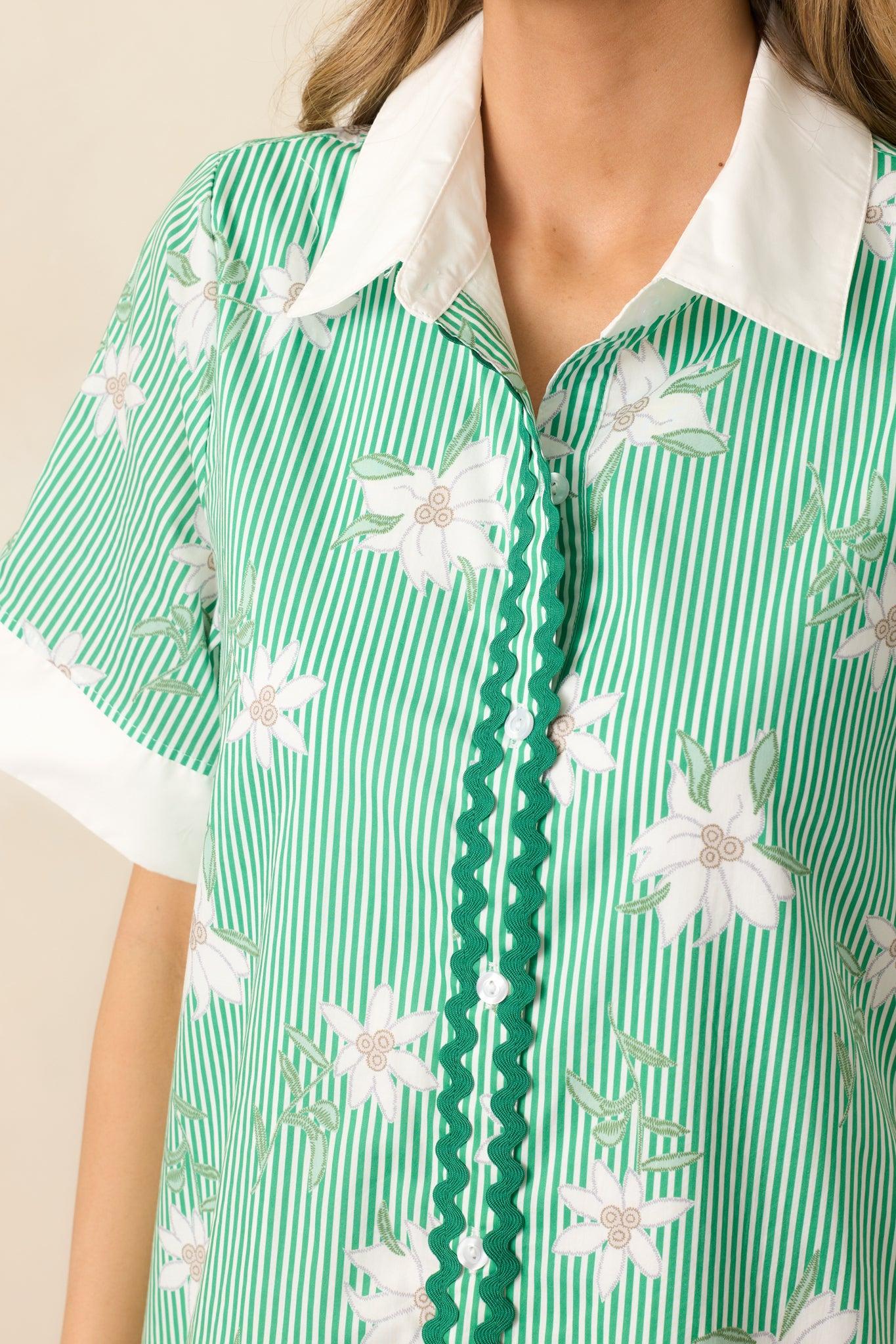 Upgrade your city lunch look with our Green Floral Cotton Mini Shirt Dress. Made with breathable cotton and a flattering silhouette, this dress will keep you cool and comfortable while still looking stylish. Perfect for any occasion, from a casual day out to a fancy lunch date. Elevate your wardrobe with this must-have piece. This green dress features a white collared neckline, a functional button front, stripe and floral print, and short sleeve design with white cuffs.