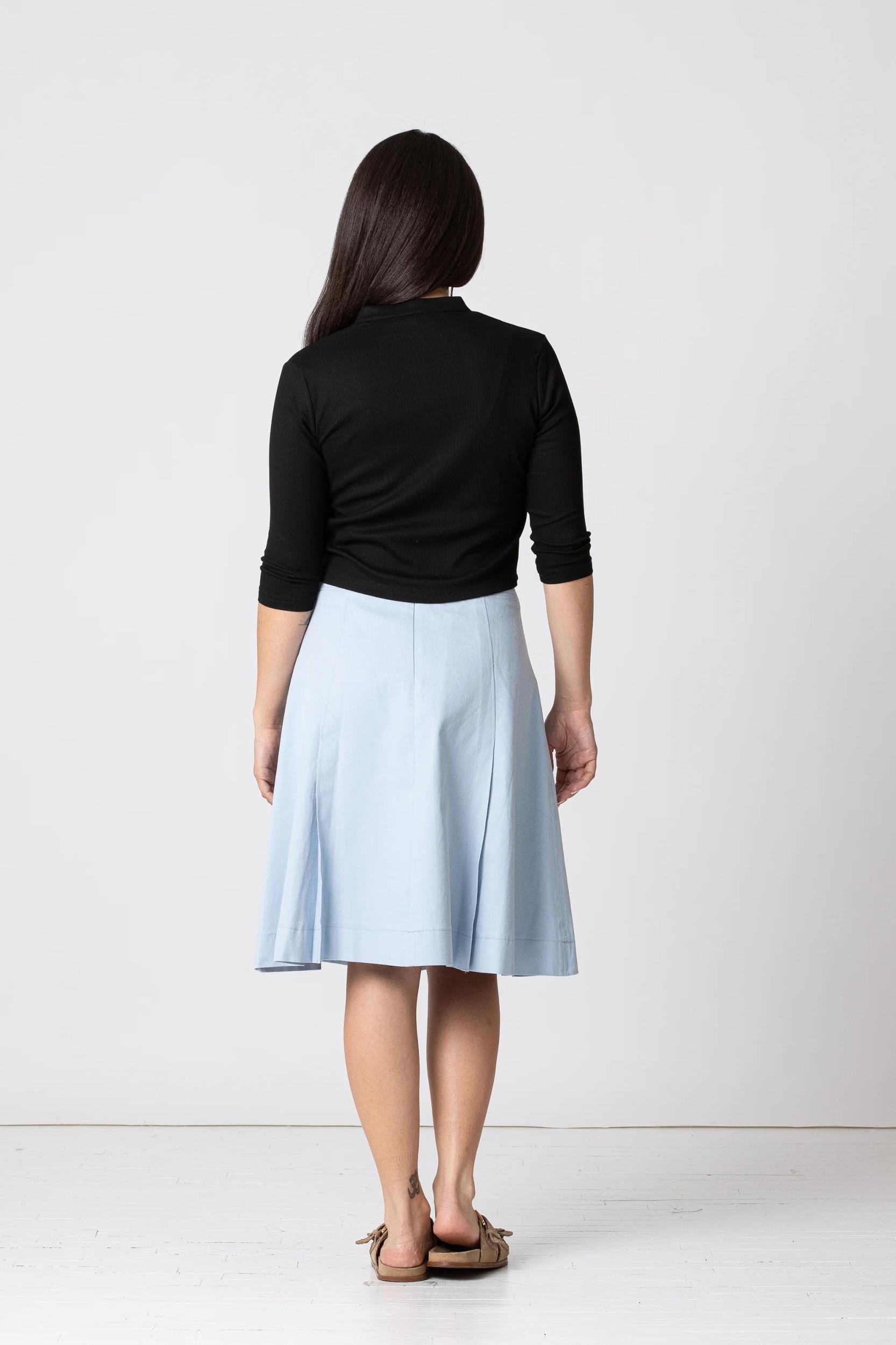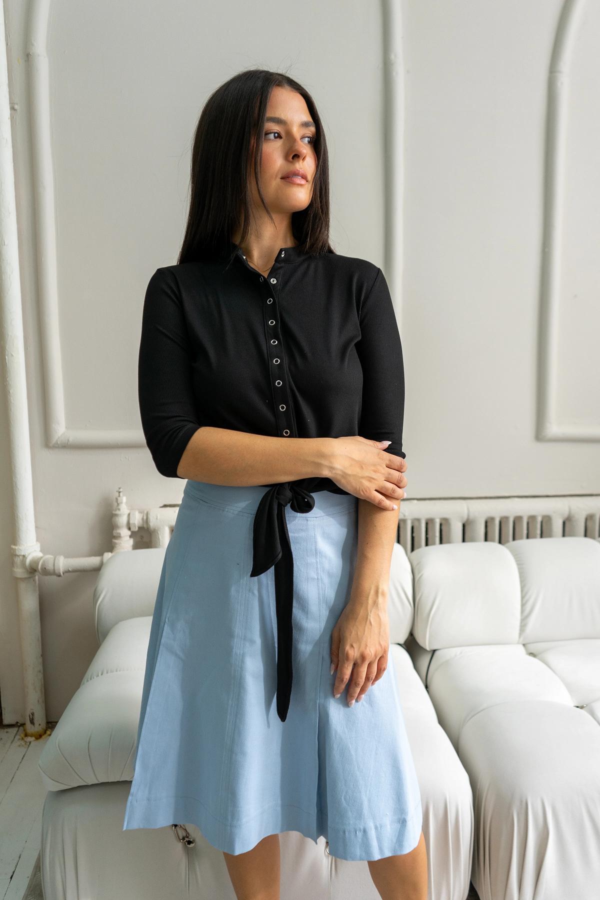 The Orion Shirt features a cute tie detail at the hem and a fitted bodice. The buttons are placed closer together to ensure modest coverage. Made from lightweight ribbed material, this shirt is the perfect polished basic.