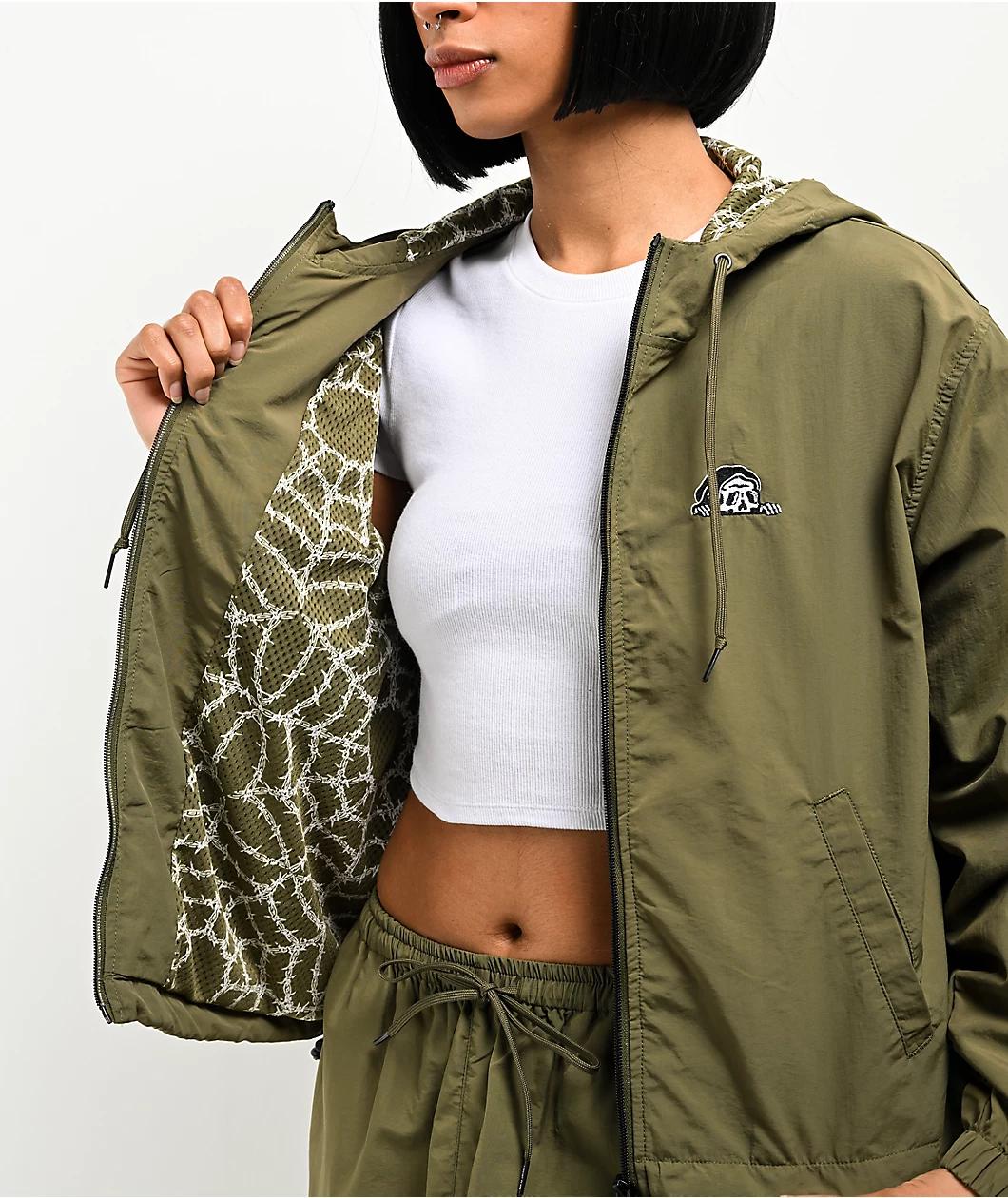 Coming in an olive green colorway, the Barbed Web zip jacket from Lurking Class by Sketchy tank is the perfect lightweight layer to finish off any spring or summer outfit. This windbreaker jacket features a soft mesh-lined interior for comfort and in