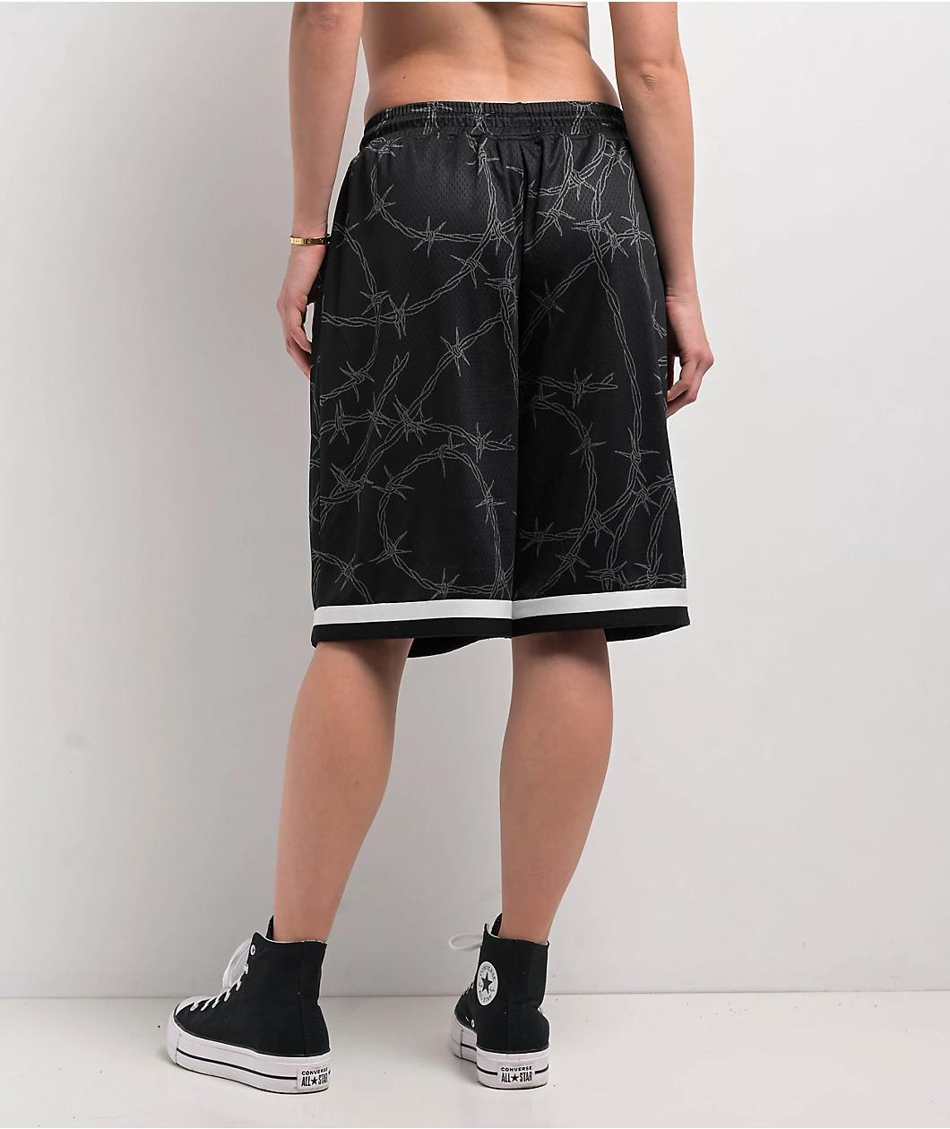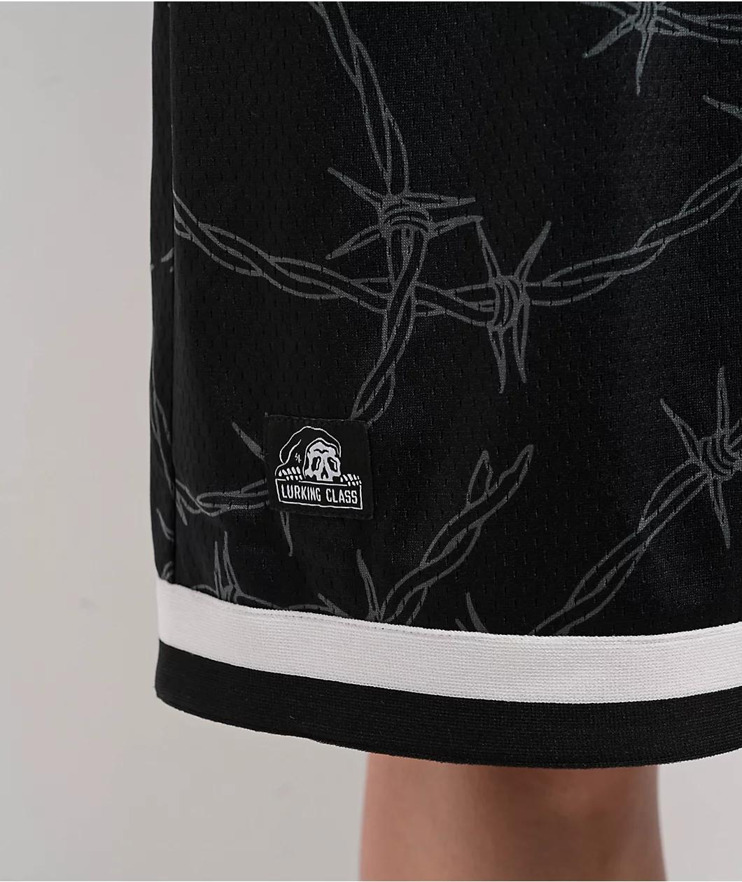 Landing in an oversized, ultra-loose fit from Lurking Class by Sketchy Tank, the black Barbed Wire mesh shorts are decorated with the pointy security Wire throughout for a tough vibe. Inspired by basketball uniforms, the breathable polyester bottoms
