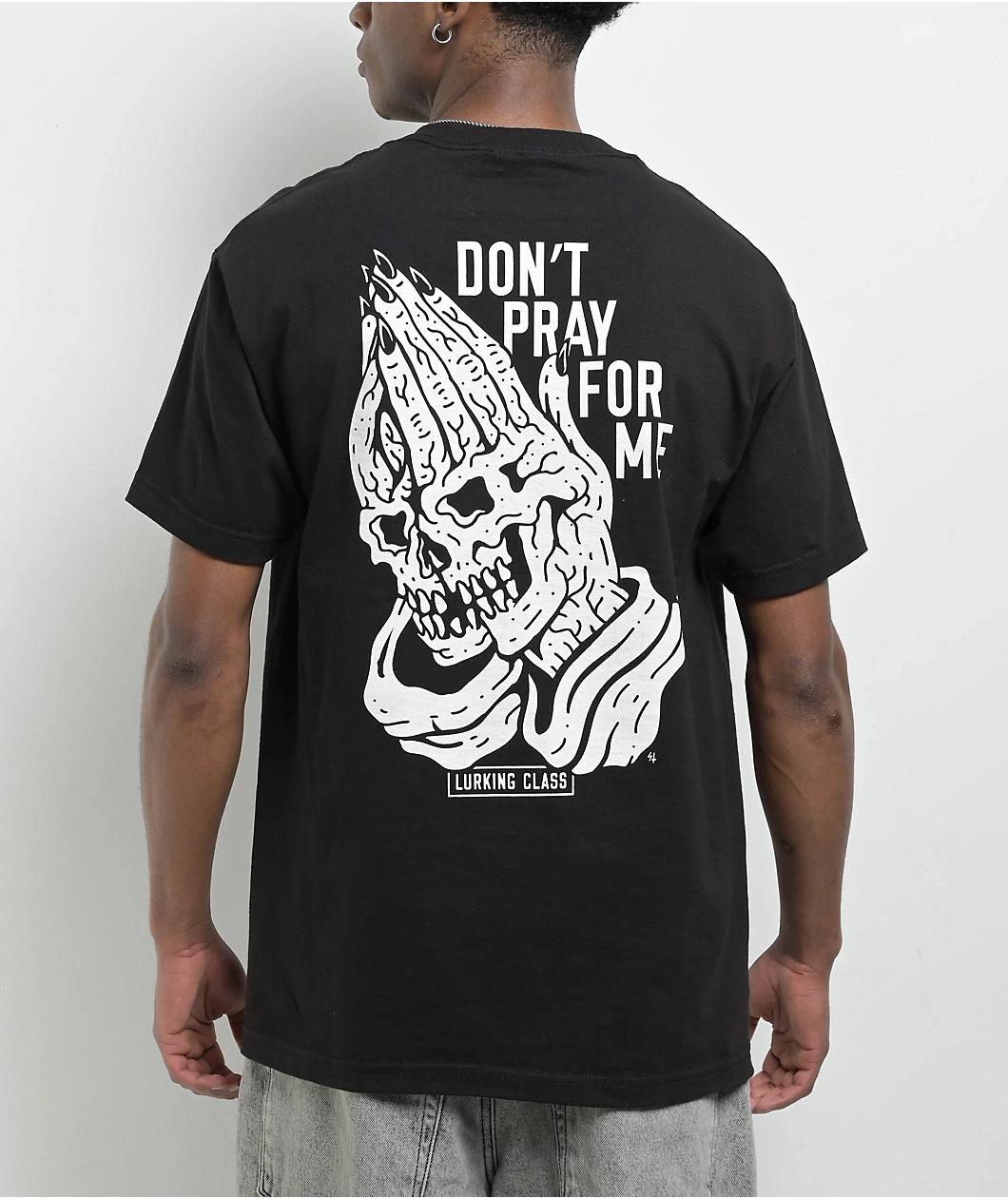 Available from Lurking Class by Sketchy Tank in a black cotton construction, the Don't Pray For Me t-shirt displays printed graphics on the left chest and back for a casual look with sinister vibes. Mimicking religious imagery of two hands in prayer,
