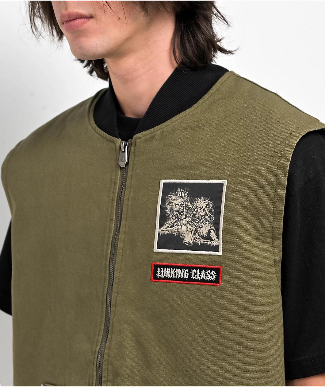 The Global Infestation vest from Lurking Class by Sketchy Tank comes in a green and black colorway with patches woven into the left chest and back, boasting various zombie figures in the brand's classic