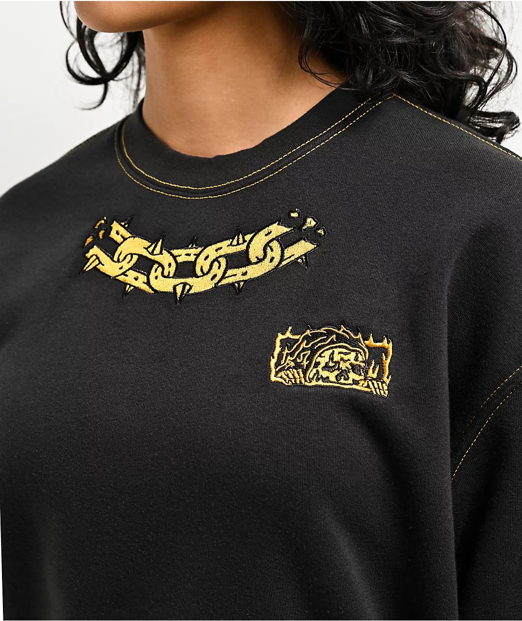 Lurking Class by Sketchy Tank presents the Hotbox Flash crewneck sweatshirt in a black colorway with gold contrast stitching and graphics. The embroidered designs are inspired by flash tattoo artwork, with a range of designs including spiked chains,