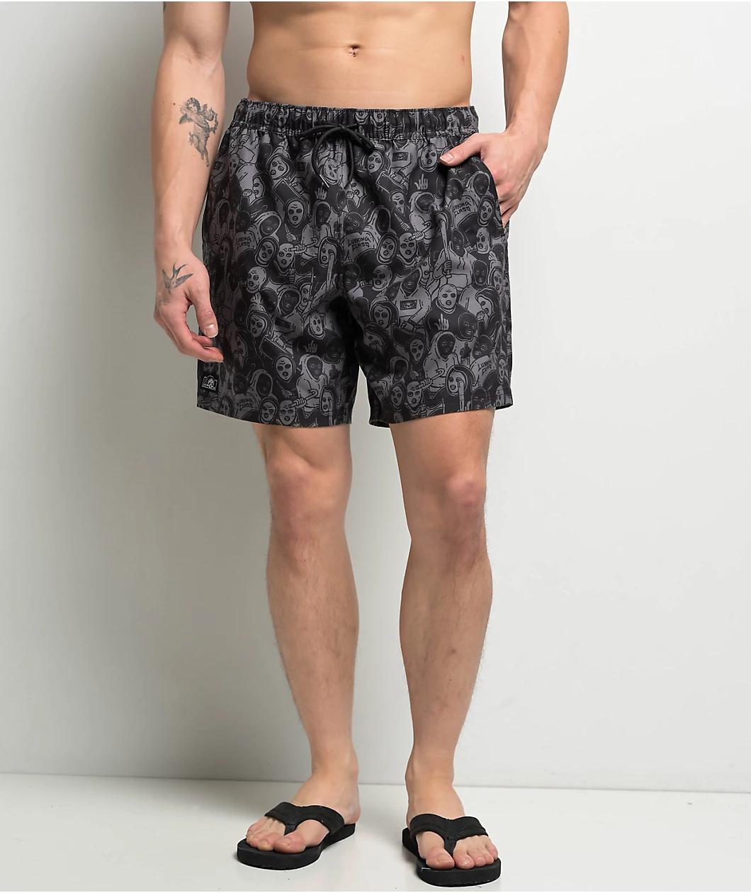 Bring all the goons swimming with the Mob board shorts from Lurking Class by Sketchy Tank, offered in a black colorway with printed, detailed graphics throughout. Showcasing a shoulder-to shoulder crowd of characters in ski masks wielding weapons an