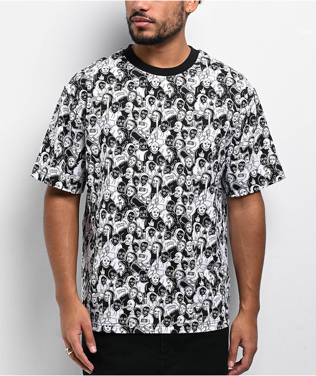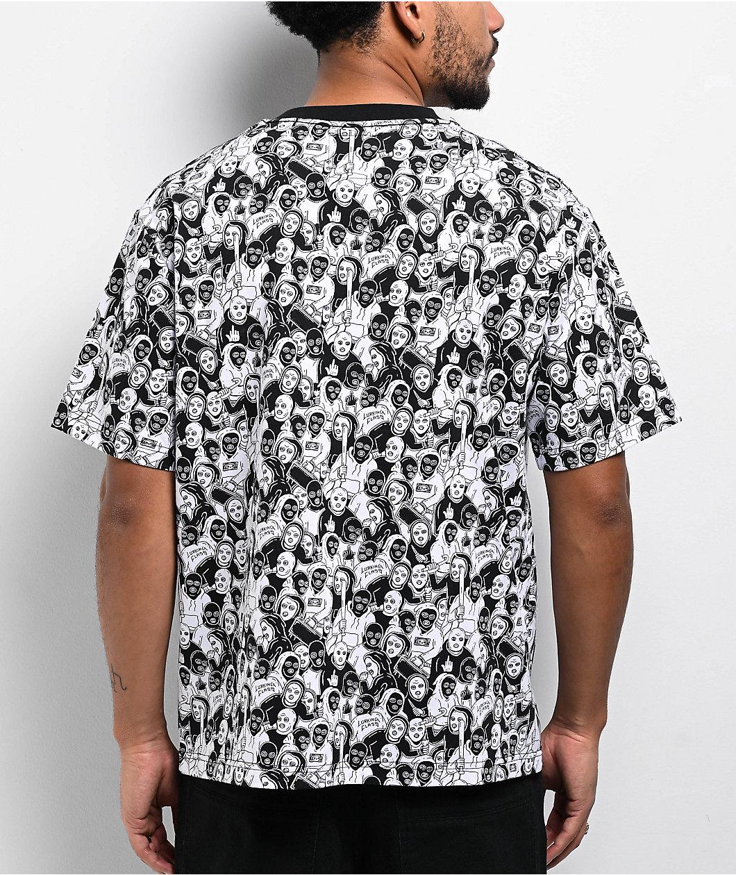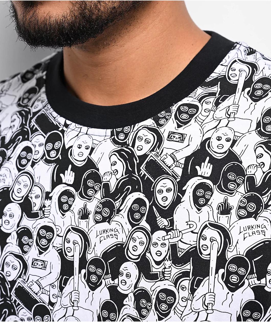 Add a bold rebellious vibe to any outfit with the Mob t-shirt from Lurking Class by Sketchy Tank. A black and white printed graphic throughout features art of an Army of goons in masks wielding bats and their middle fingers for a counterculture feel.