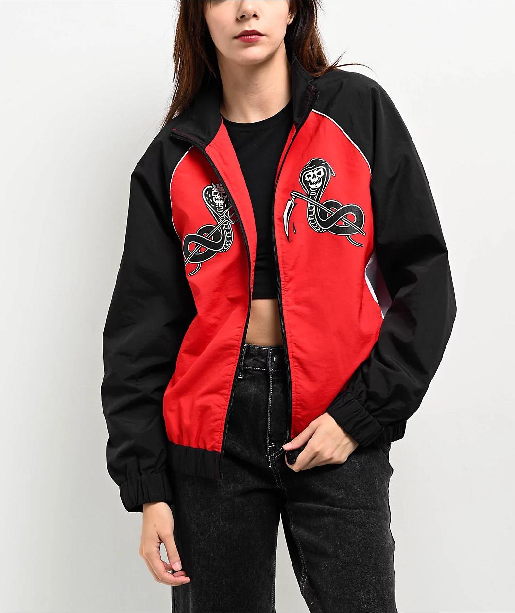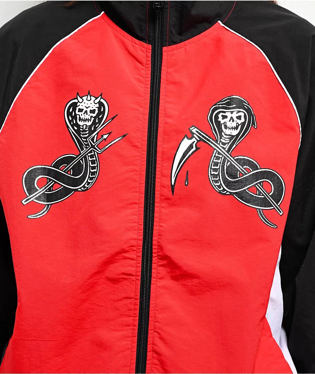Combining sporty style with dark imagery, Lurking Class by Sketchy Tank presents the lightweight Slither track jacket in a black and red color scheme with contrasting white accents. A full zip closure splits demonic screen-printed graphics on the che
