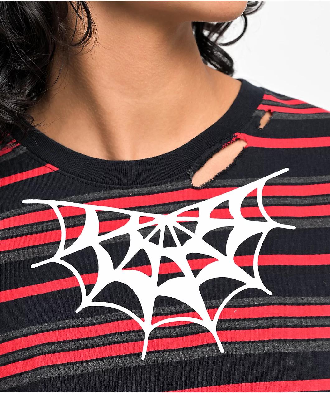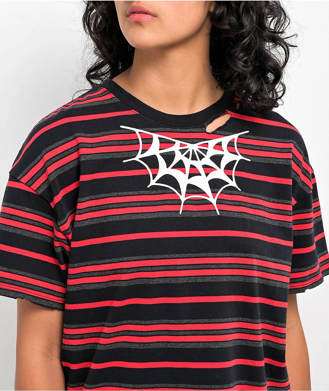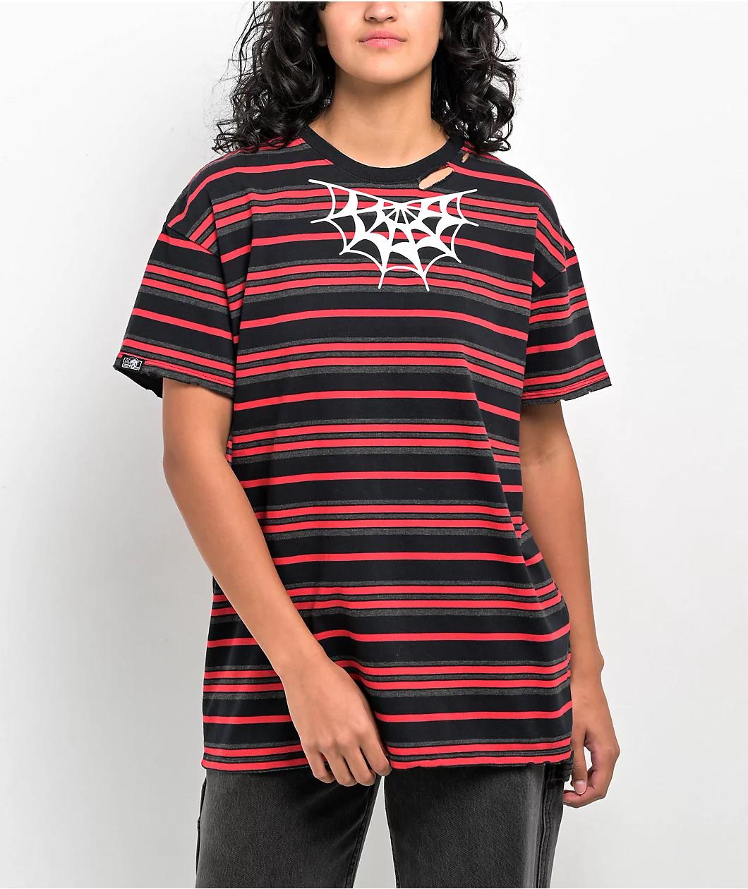 The Spider Web t-shirt from Lurking Class by Sketchy Tank features black and red stripes throughout, with distressed detailing along the collar and sleeves. White spider web accents are printed along