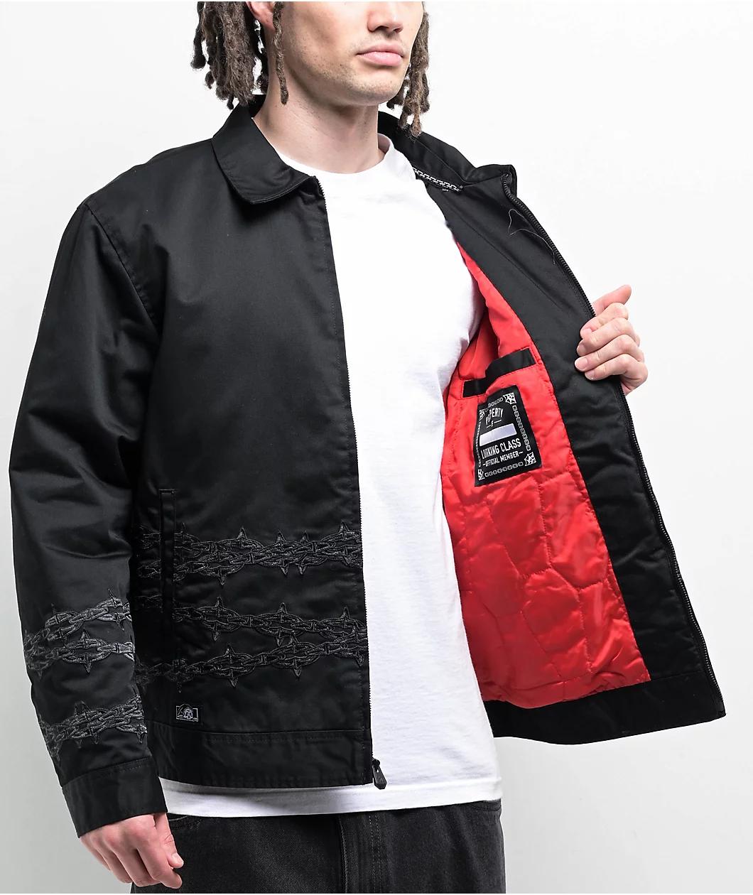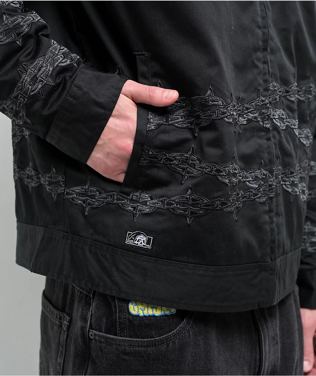 Add an edgy alternative vibe to your outfit with the Spiked Chain work jacket from Lurking Class by Sketchy Tank in a sleek black colorway. An embroidered Spiked Chain motif wraps around the bottom portion of the jacket, boasting branding on the left